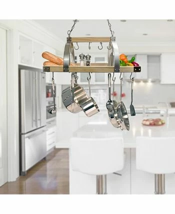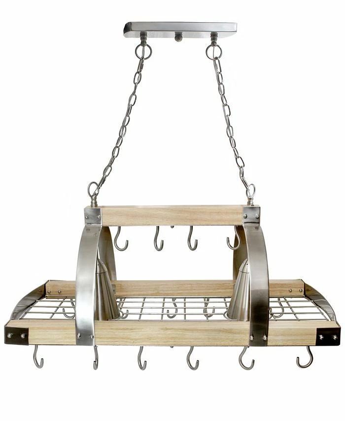 Update your kitchen in style with this industrial styled two light pot rack fixture featuring a natural wood finish. Make your pots and utensils easily accessible in a stylish way with this traditional design, as well as extra lighting for your every day tasks. Comes with 2 chains (each measures 16″), 2 feet of cord (from top of fixture) and 16 hooks. Fixture requires two 60-Watt Type A standard medium base incandescent bulbs (not included).
