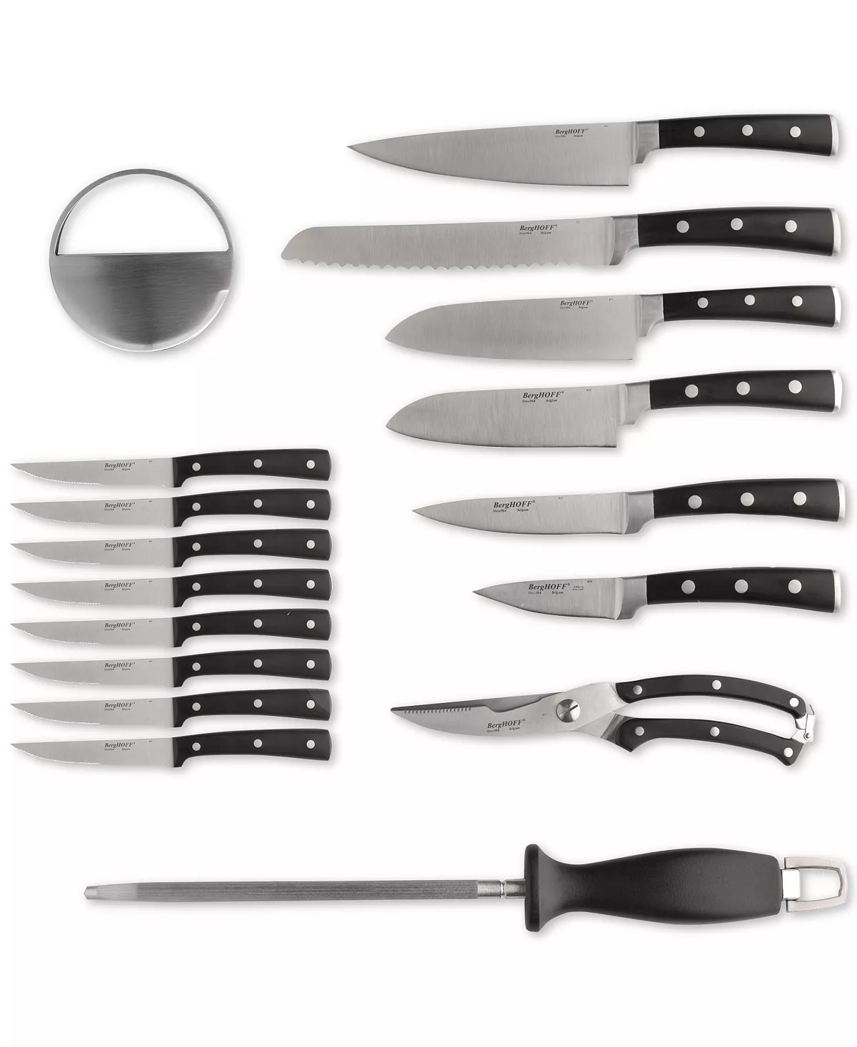 A 20-piece collection of kitchen essentials, this knife set from BergHoff includes a well-rounded assortment of prep-work must-haves plus accessories. The stylish block features a rotating base and a removable steak-knife block.