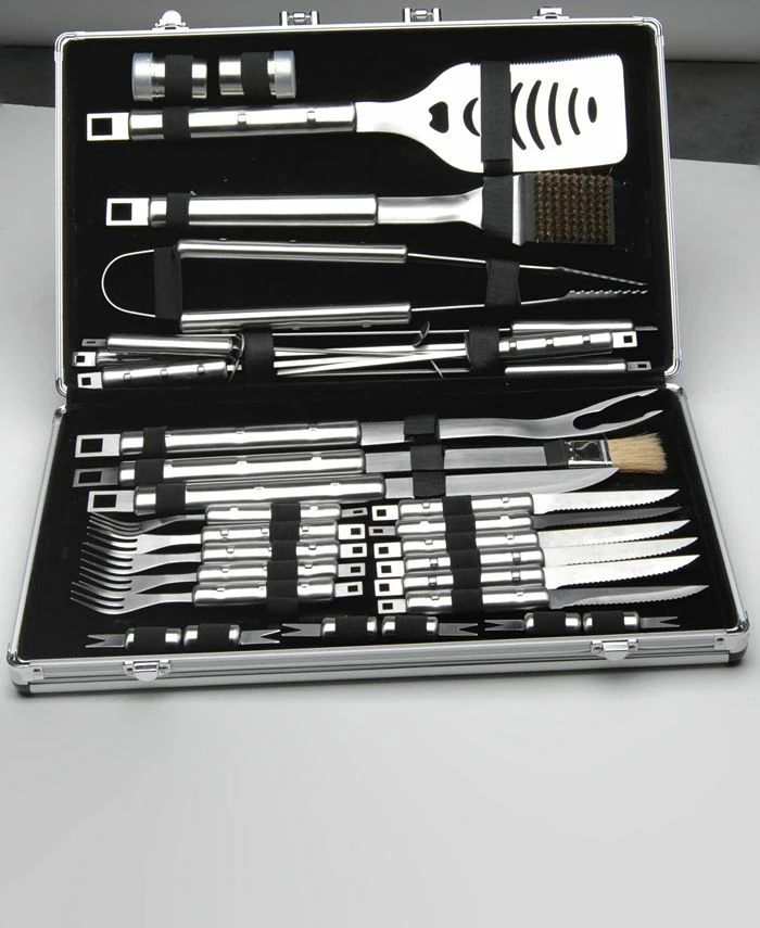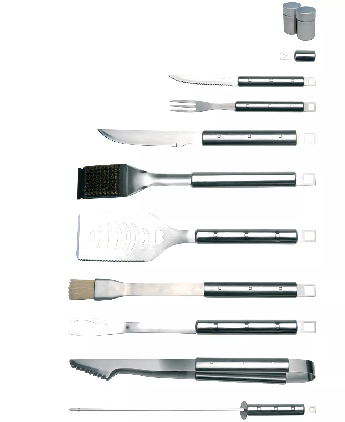 Cubo’s 33 Piece BBQ Set has everything you need to spend quality time with family and friends while enjoying delicious meals is an important part of your social life. Set includes: (2 1/2″) salt cellar, (2 1/2″) pepper pot, 6 (2 1/4″) corncob holders, 6 (10″) steak knives, 6 (10″) steak forks, (16 1/2″) barbecue knife, (18″) grill scraper, (18″) slotted turner, (18 1/2″) small brush, (18 1/2″) meat fork, (18 1/2″) tongs, 6 (18 1/2″) skewers, and carrying case. Perfect for hobby and professional cooking!