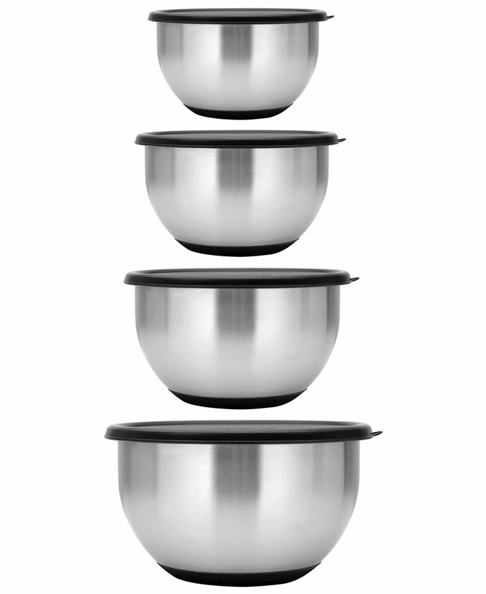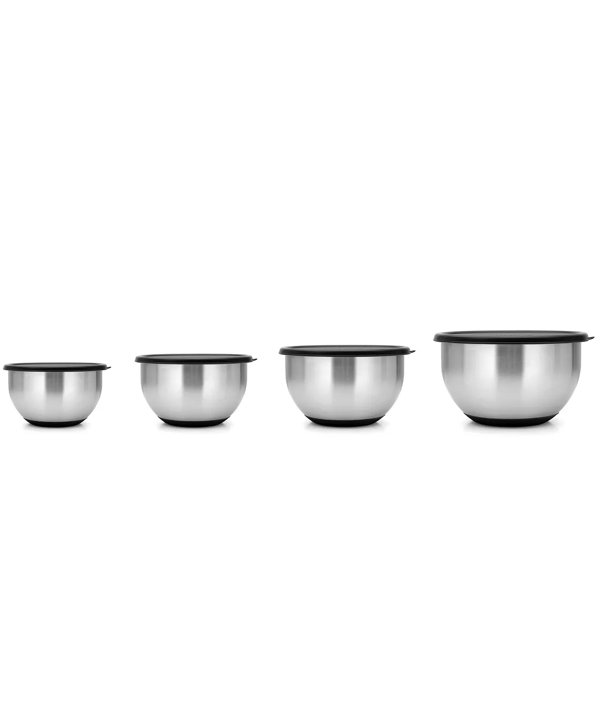 This 8 piece set is not only beautiful but extremely handy. You can whip up fresh whip cream, or cake batter and put the lid on to come back to it later. No more mess with seran wrap, just pop the lid on and your good to go! Sleek stainless steel color with black lids, for a classic style. Set Includes: 4 Bowls – 1.6-qt mixing bowl with lid, 2.1-qt mixing bowl with lid, 3.1-qt mixing bowl with lid, and 4.8-qt mixing bowl with lid.