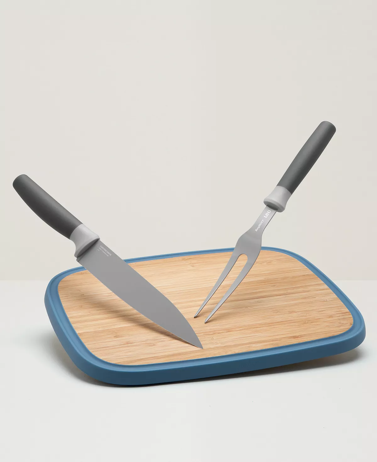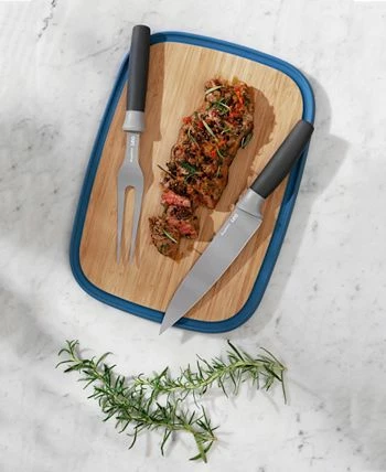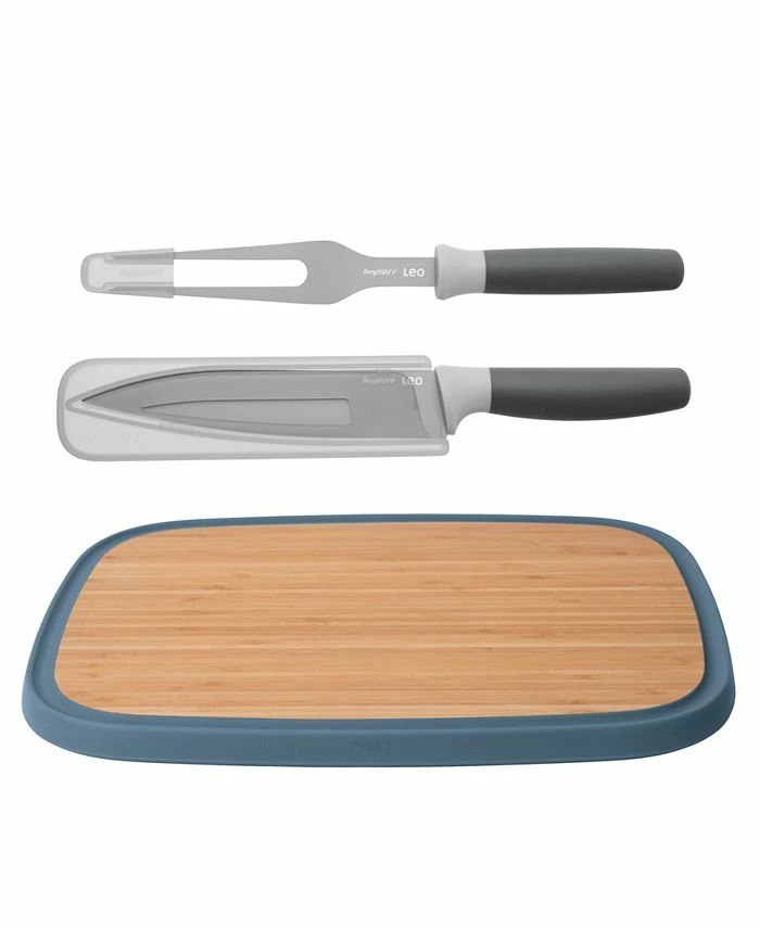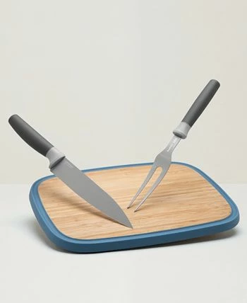 Slicing or carving ham, turkey, chicken, etc. has never been easier than with this complete carving set. The carving fork easily holds your meat, fish or poultry securely in place while you cut precise slices with the sharp stainless steel carving knife. The blade’s non-stick coating ensures the food doesn’t stick to the knife while the fork and knife’s soft-touch handle ensures a comfortable grip for easy handling. The stylish bamboo cutting board is strong but lightweight and has an integrated juice groove that catches juices as you cut and carve.