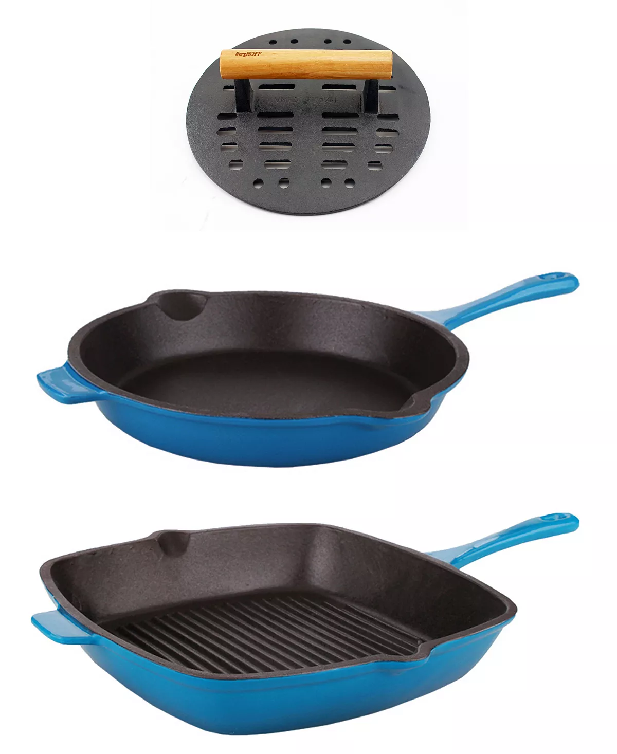 - Set includes – 1 fry pan, 1 grill pan and 1 steak press
