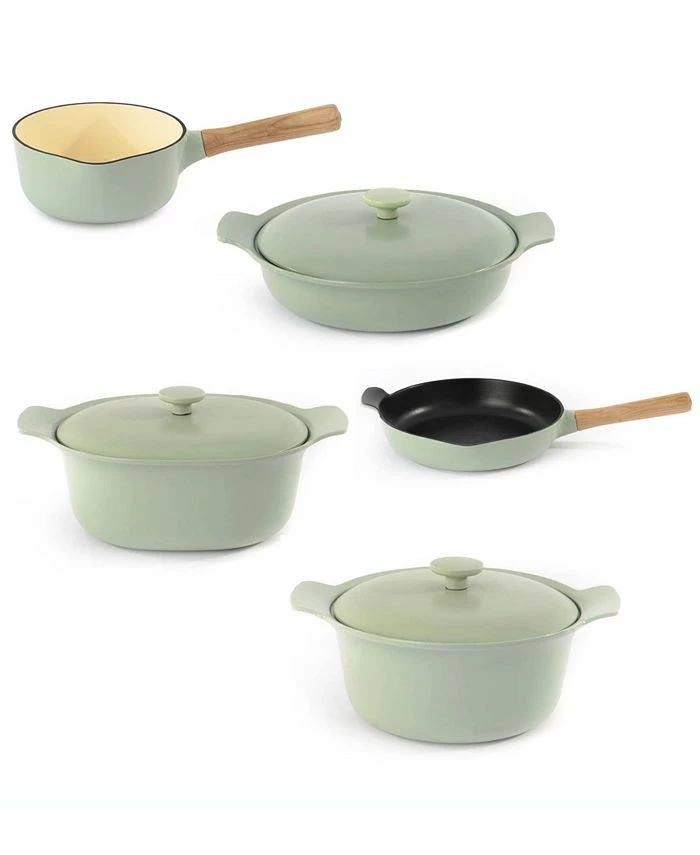 - Set includes- 7″ Sauce pan, 11″ covered deep skillet, 5.5 Quarts oval covered casserole dish, 10″ cast iron covered stockpot, and 10.25″ cast iron fry pan