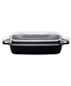 Cast aluminum body for fast and equal heat distribution. Contains a 3-layer fern ceramic coating making it non-stick, eco-friendly, and safe PFOA and PTFE free. Glass lid with long black silicone detachable stay cool handles. Suitable for all heat sources.