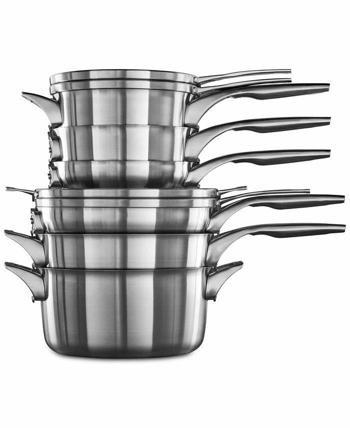 - Stacks smaller and nests in any order, saving up to 30% more space* (*Average space saved vs. like non-stacking Calphalon cookware items.)