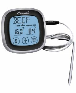 The Escali touch screen thermometer and timer has preset cooking temperatures for your beef, pork, chicken, turkey, veal, lamb, ham and fish. Set and monitor your cooking temperatures by inserting the probe into your food in the oven or grill and close until the desired temperature is achieved and timer sounds.
