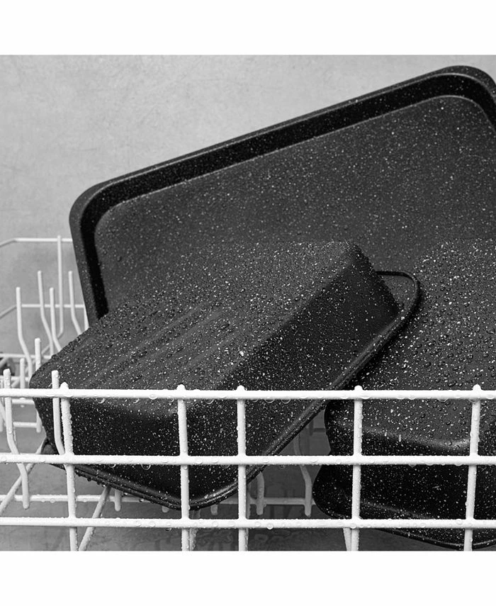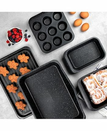 - Set includes: a cookie sheet, loaf pan, square baking pan, large roaster pan with rack and muffin pan