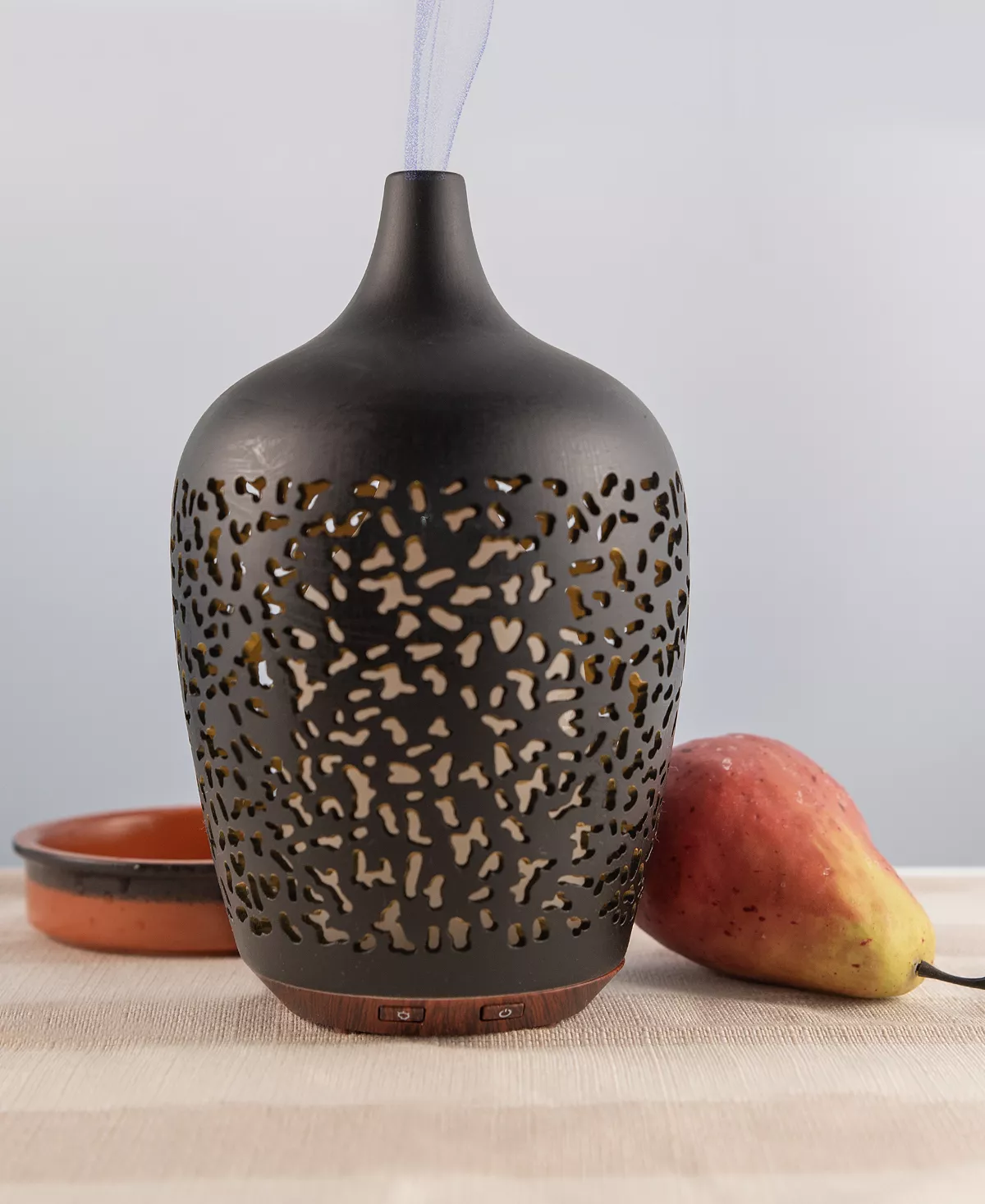 Handcrafted black ceramic with organic patterned cut out design, the Elena diffuser makes a statement in any room. Compliment your aromatherapy experience with a variety of light features.