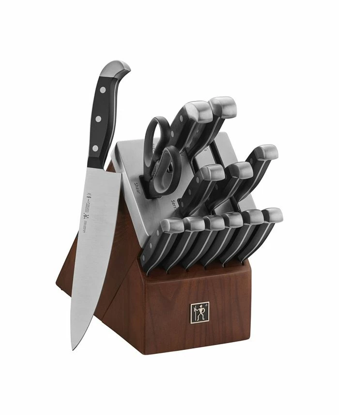 - Set includes – 3″ paring knife, 5″ serrated utility knife, 5″ prep knife, 8″ bread knife, 7″ santoku knife, 8″ chef knife, 4.5″ steak knife (6 pieces), shears, sharpening module knife block