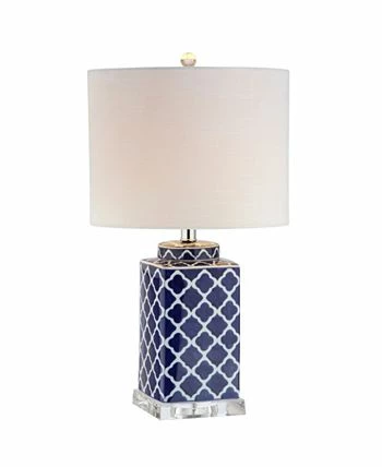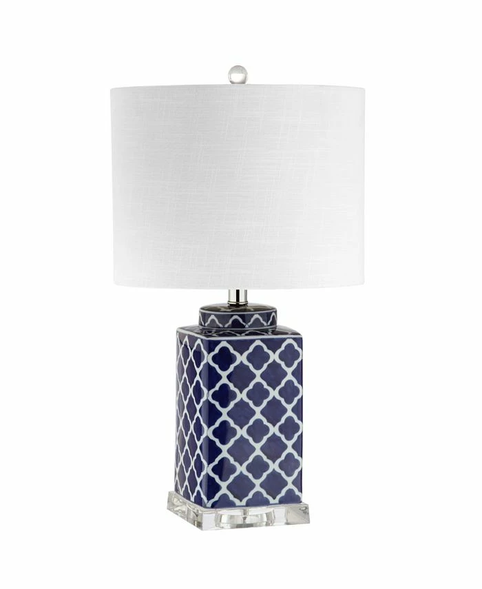 Nothing combines classic and bold like the trellis pattern, which makes it a perfect fit for the equally-versatile square ginger jar shape. A crisp linen drum shade with rolled edges tops the look. Finished with a lucite finial and silk-wrapped cord.