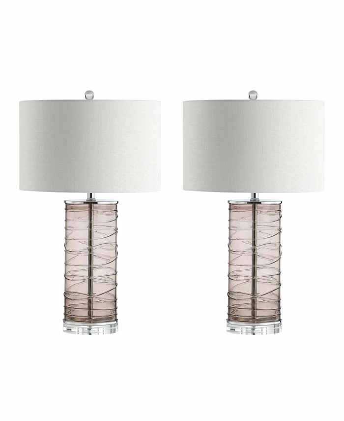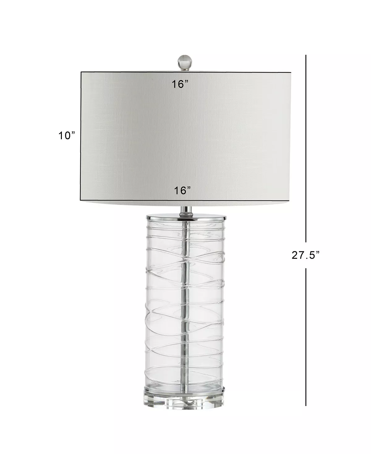 A pair of lamps to add sparkle to your space. Ribbons of glass create unique patterns on this lamp’s glass cylinder base. The clean, simple lines and a drum shade have mid-century modern flair, while the cobalt blue glass adds a touch of glam.