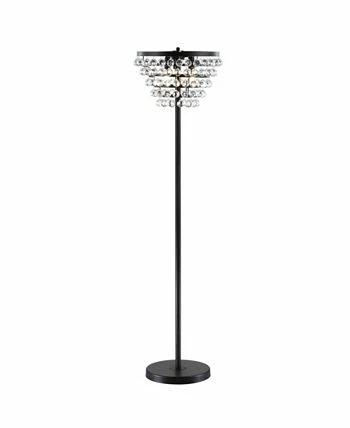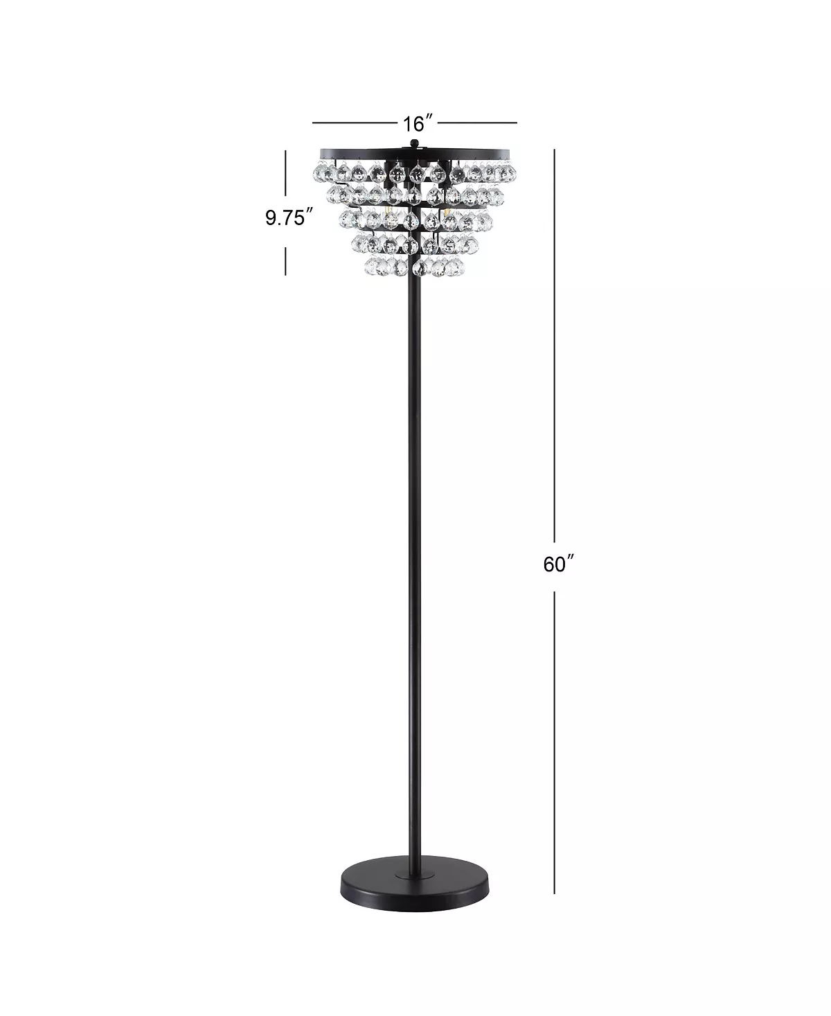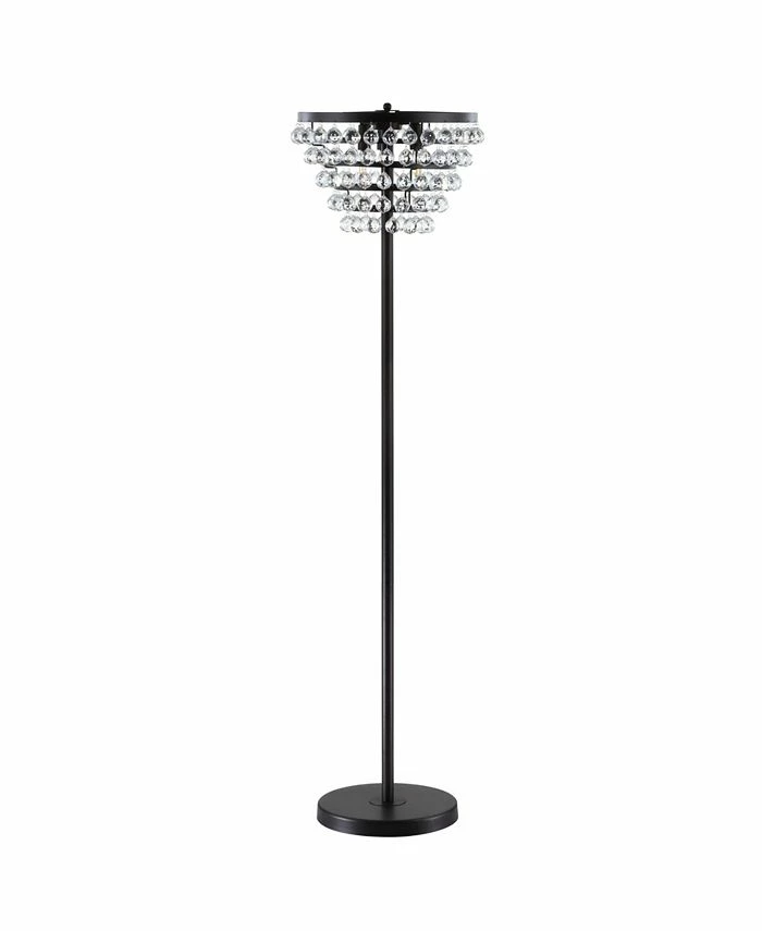 Large crystal droplets catch the light enhancing the shimmer of this stunning floor lamp and adding timeless elegance to any room. With the shade hanging in five tiers this floor lamp gives the effect of a chandelier without the hardwired installation or required high ceilings. The scale is perfectly suited for a living room or bedroom.