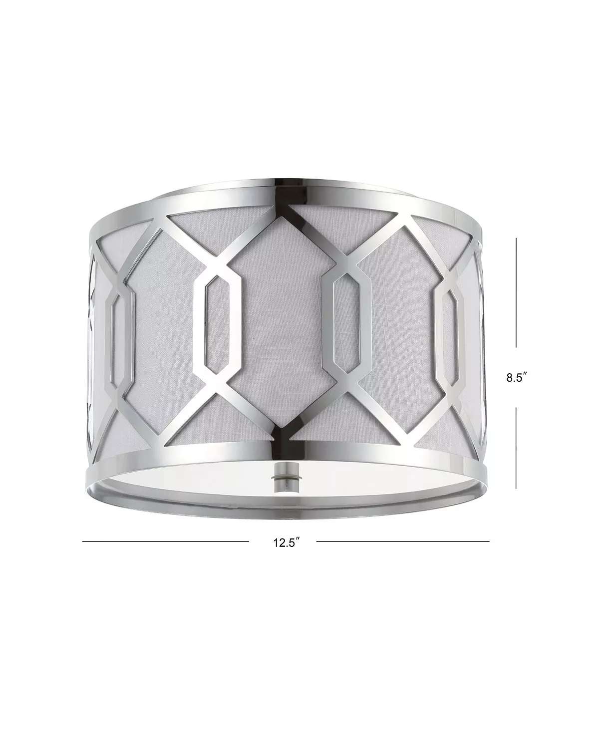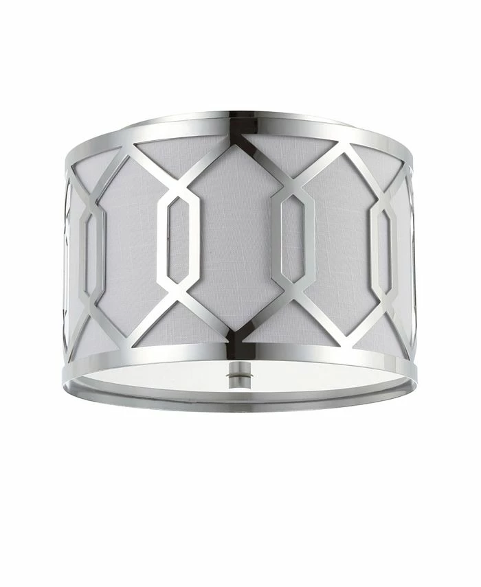 Ideal scale for smaller rooms, this 2-light ceiling flush mount is finished in an eye-catching polished chrome. With only 8.5″ of drop and just 12.5″ in diameter, this is an idea design for high or low ceilings. A linen shade is complemented with a geometric fretwork of overlapping hexagons that adds a decorative touch to any interior.