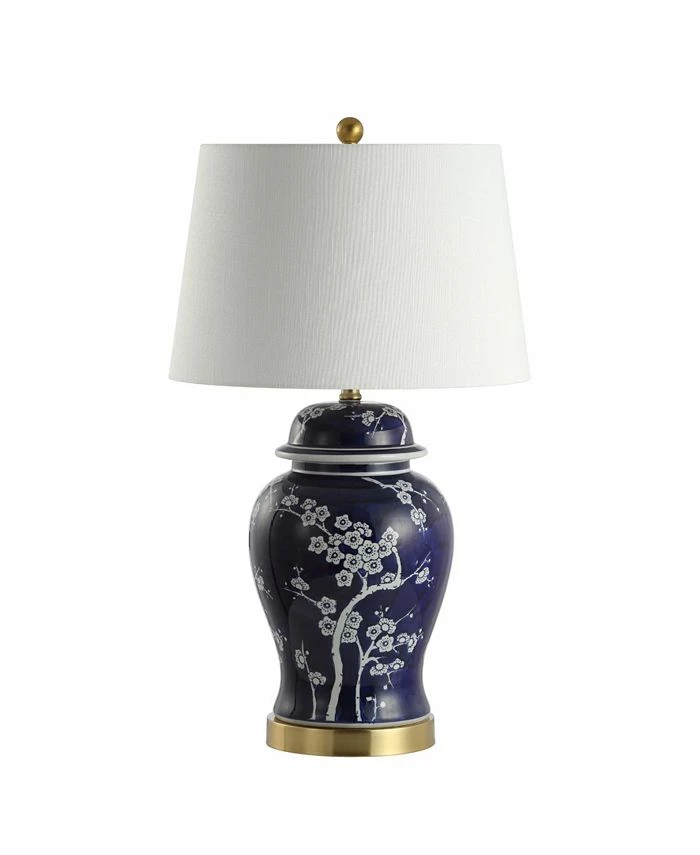 This table lamp is hand-painted and glazed with a cherry blossom motif and then finished with antiqued brass ornamentation. A classic chinoiserie shape, this large ginger jar base is sure to make a statement on a console or buffet. Finished with a brass finial and cotton drum shade on the top and a silk-wrapped cord in the back, it’s the perfect addition to your traditional space.