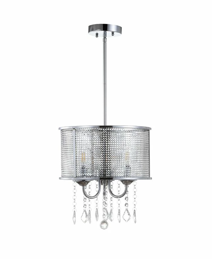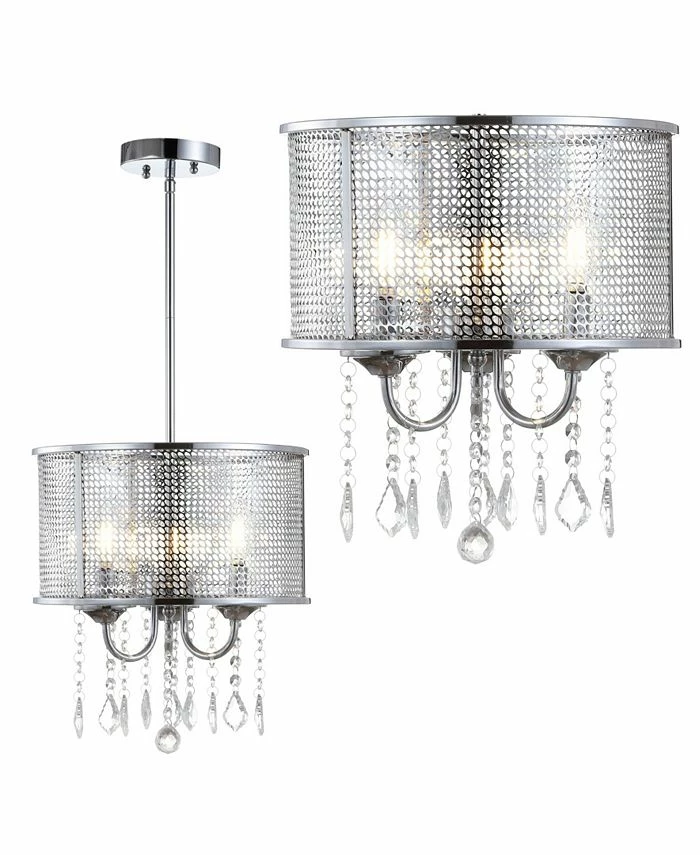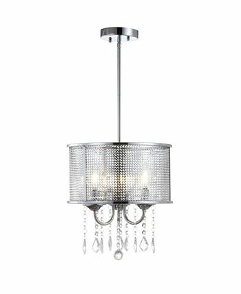 Shimmering with veiled elegance and the luminous glow from three bright bulbs reflecting off the metal mesh shade, this metal and crystal chandelier will not go unnoticed. The gleaming chrome rods are adjustable to perfectly fit your space, and the dangling faceted crystals are framed by a shimmery sheer shade that lends this fixture a timeless effervescent appeal. Whether for over a dining room table or adding a lux touch to a bathroom, this fixture would stun with any decor.