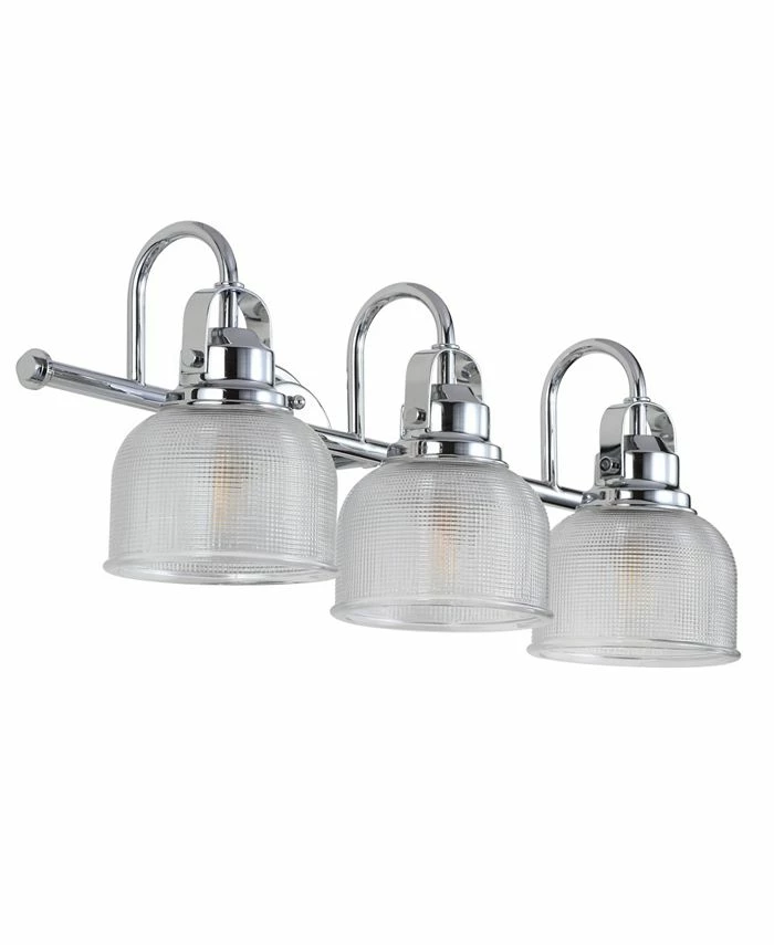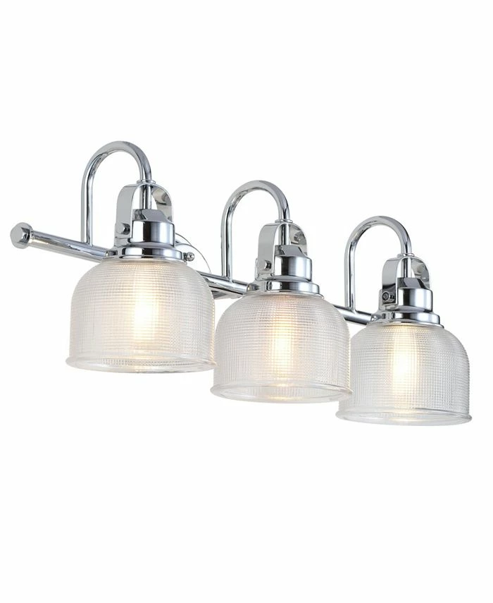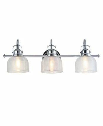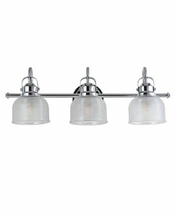 - Textured glass and polished chrome come together to create a chic, classic combination for this vanity light
