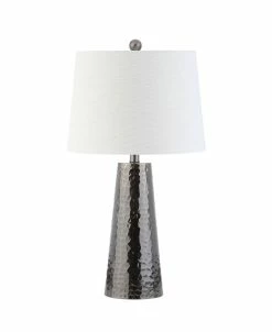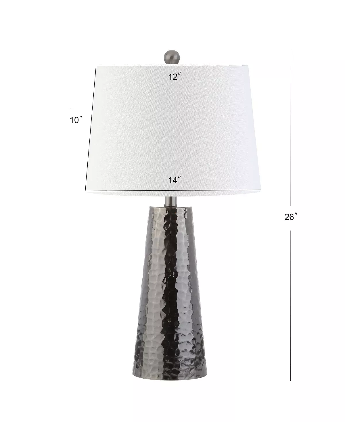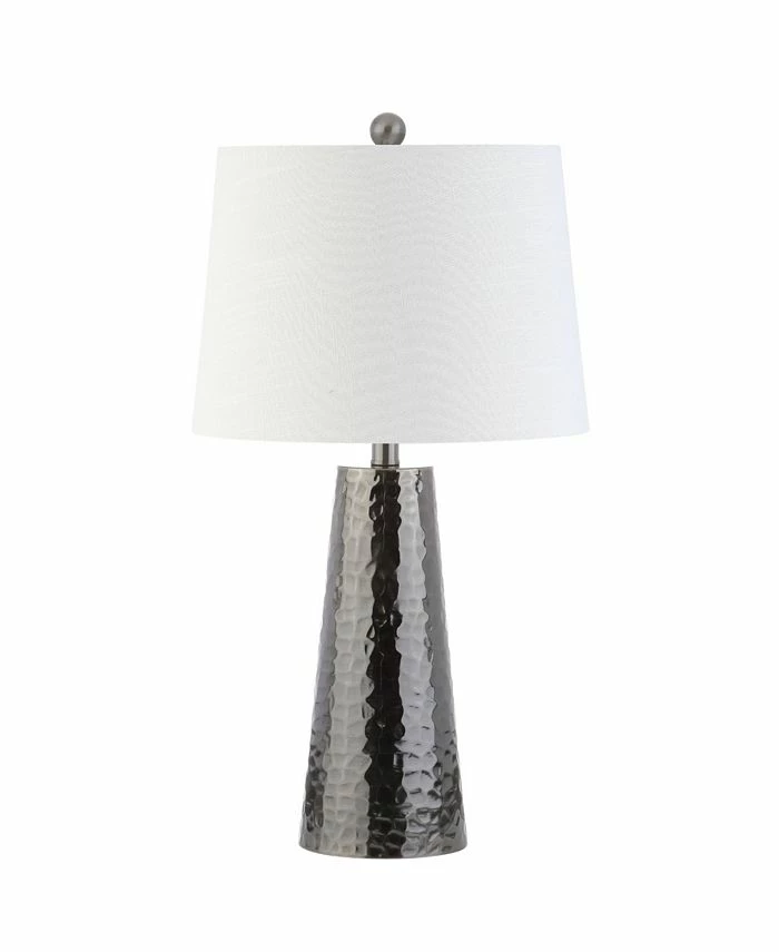 Featuring a dimpled effect that creates dimension and texture, this modern hammered table lamp adds style and light to any dim corner. In a black nickel finish that matches the finial on top, no detail was overlooked in the design of this striking piece. Topped with a white linen shade and finished with a silk-wrapped cord.