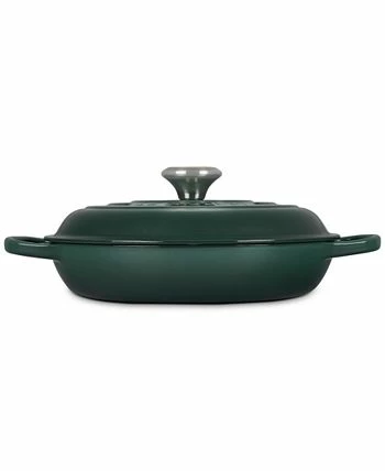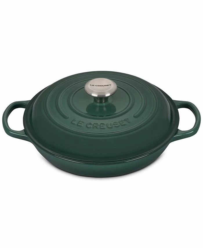 The enameled cast iron braiser is uniquely designed for maximum performance, transforming tough cuts of meat and hearty vegetables into tender, flavorful dishes. Food is first seared over high heat, then finished slowly in a flavorful liquid. The wide base of the braiser allows ingredients to be placed in a single layer for proper searing; once liquid is added, the domed lid continuously circulates steam to lock in moisture and flavor.