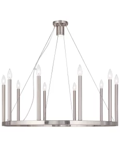 Give your room contemporary polish with the Alpine Chandelier light from Livex. Ten lights set in a chic brushed nickel-tone cast a cool glow along with a halogen center down light.