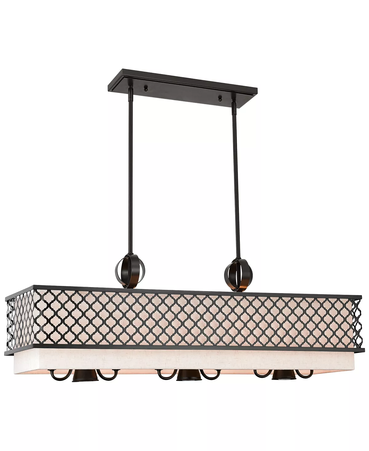 Add a modern finishing touch to a kitchen or dining room with the handcrafted oatmeal-hue shade and cutout, rich-tone English bronze finish design of the splendid handmade Arabesque nine-light Linear Chandelier by Livex.