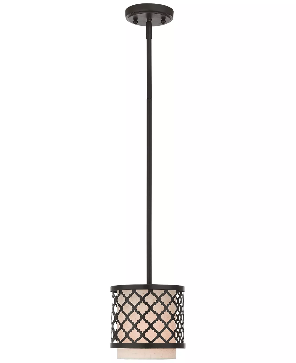 Add a modern finishing touch to kitchens, hallways and dining rooms with the handcrafted oatmeal-hue shade and carved, rich-tone English bronze finish design of the splendid handmade Arabesque Mini Drum Pendant by Livex.