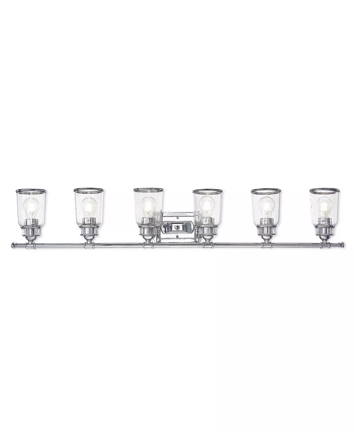 Our Lawrenceville collection features a retro industrial design, reminiscent of 19th century lighting. This six light bath vanity comes in a polished chrome finish and clear seeded glass.