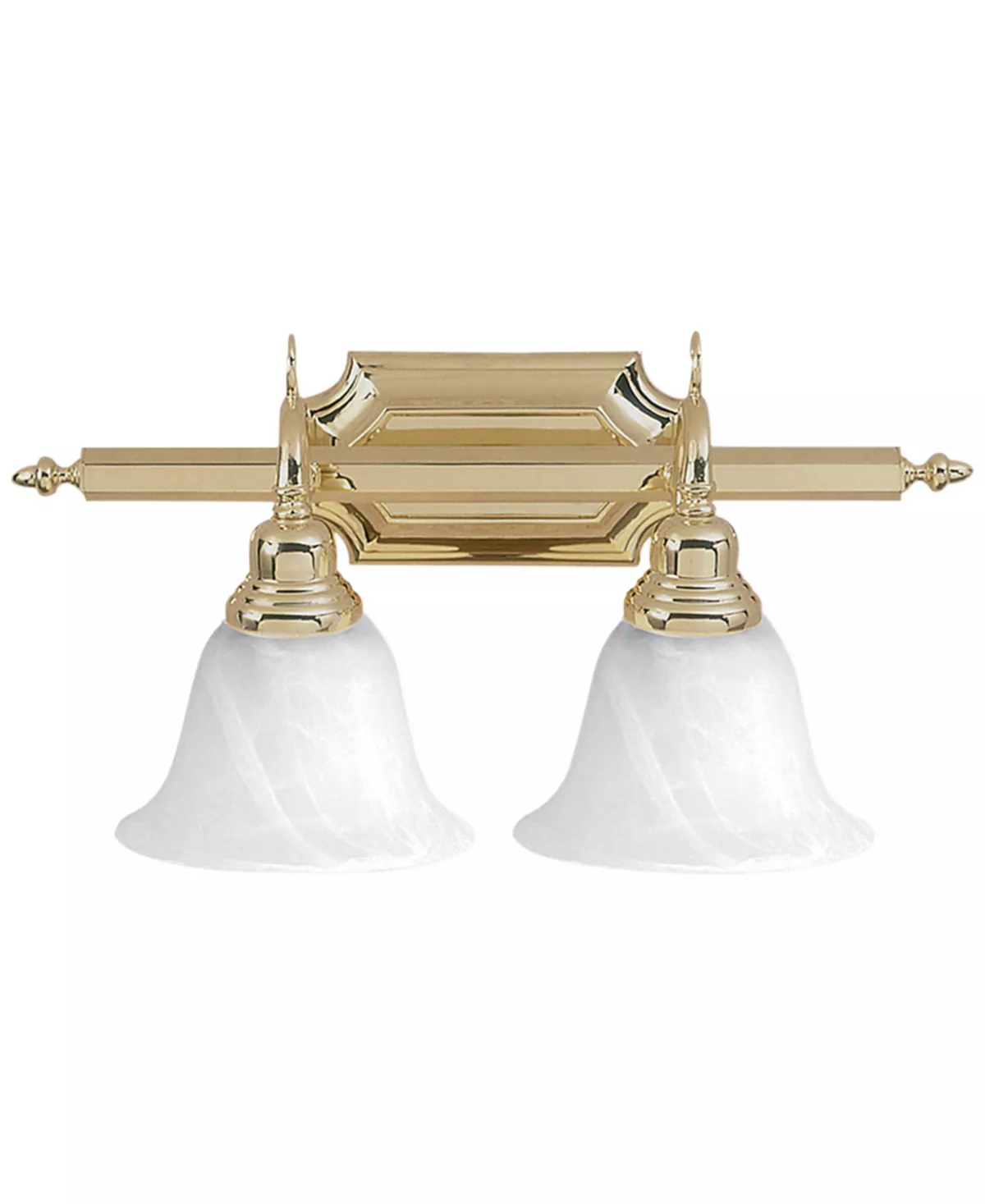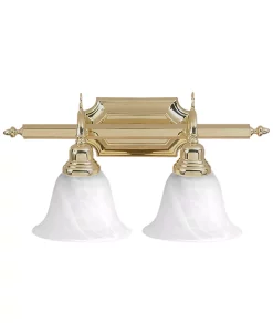 Artistry and tradition combine in the French Regency Vanity light from Livex. A lovely beveled backplate in a polished brass-tone finish supports two lights with bell shades that can be installed facing up or down.