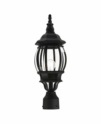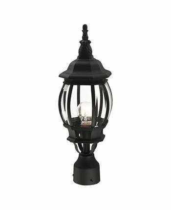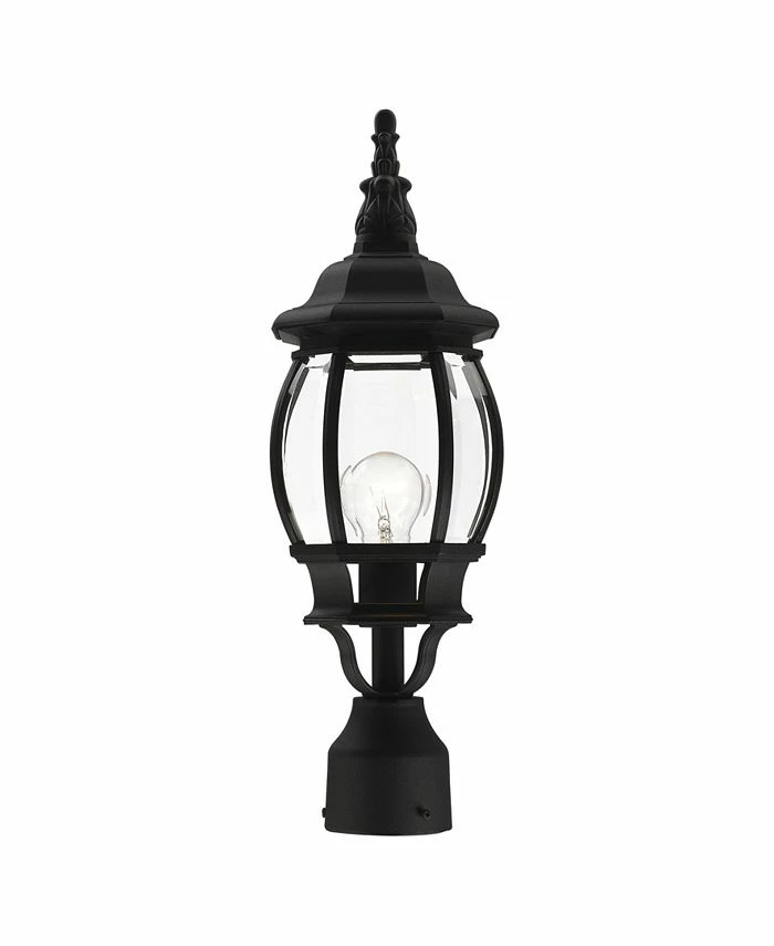 The classically transitional outdoor Frontenac collection boasts a cast aluminum structure with dazzling ornamental design. The single-light small six-sided post top lantern comes in a textured black finish with clear beveled glass and extravagantly decorative details.