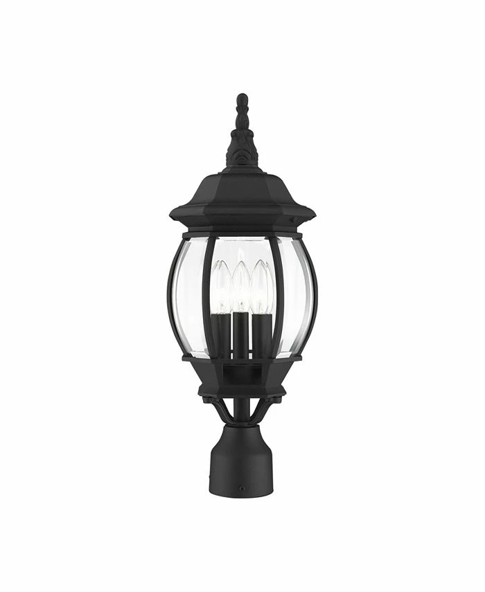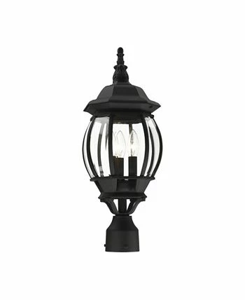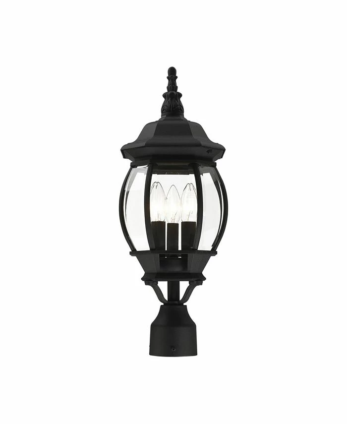 The classically transitional outdoor Frontenac collection boasts a cast aluminum structure with dazzling ornamental design. The three-light medium six-sided post top lantern comes in a textured finish with clear beveled glass and extravagantly decorative details.