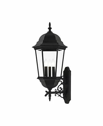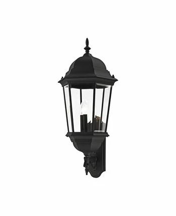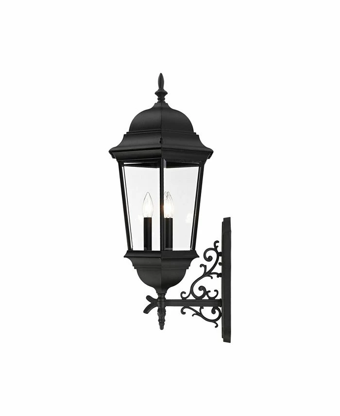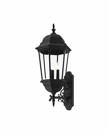 The elegant silhouette of the Hamilton collection is a classic that is sure to please even the most discriminating taste. This outdoor three-light large wall lantern features a decorative top and arm which are paired with a simple six-sided frame in this textured black with clear beveled glass.