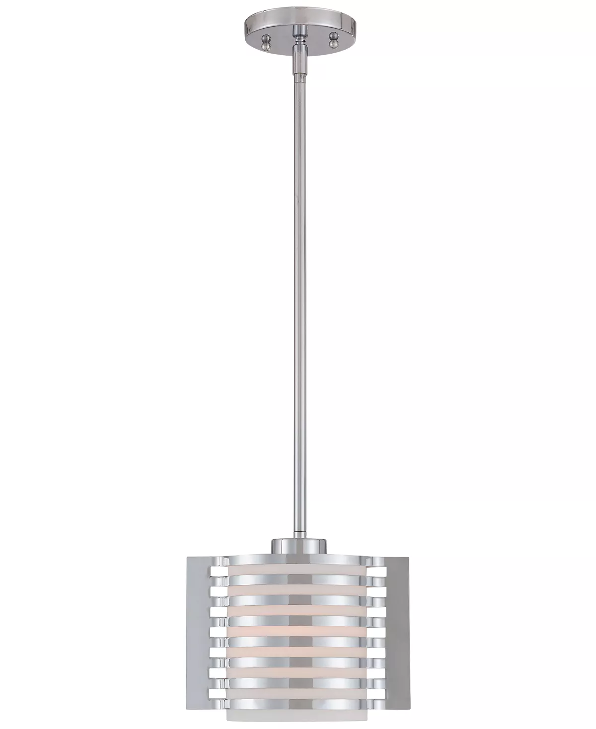 Refresh your space with the modern styling of the Hilliard mini pendant from Livex. Bands of gleaming steel surround the hand-crafted satin opal white glass shade, creating a bold effect that isn’t soon forgotten.