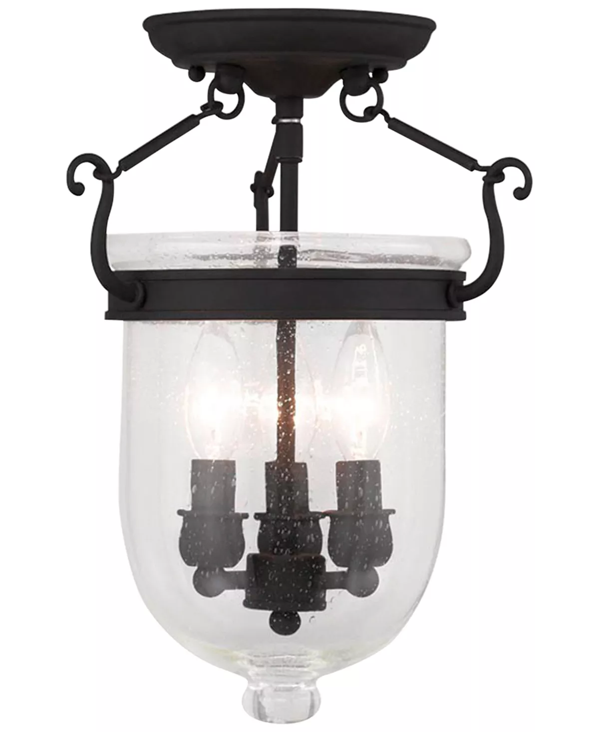 Elegant and refined, the Jefferson 3-Light flush mount from Livex is the perfect accent light for traditional spaces. Its handmade bell jar design and trio of interior lights are suspended by an eye-catching steel frame in black.