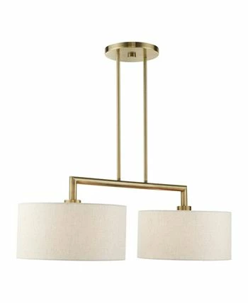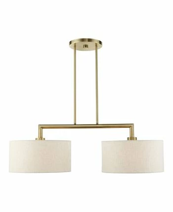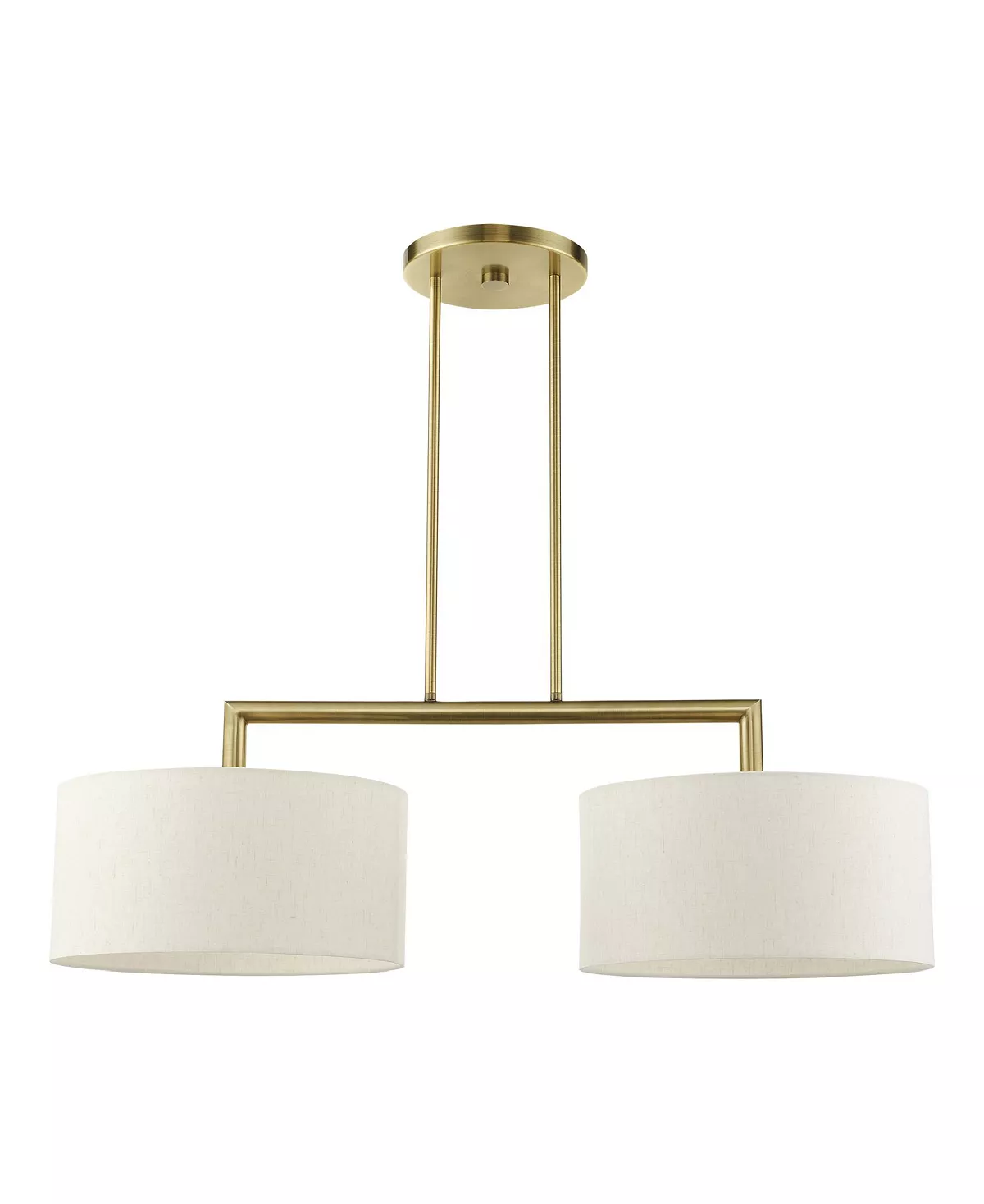 The Meridian collection has a clean, crisp look and contemporary appeal. The hand-crafted oatmeal colored fabric hardback shades offer a diffused warm light. This two-light linear chandelier has a sleek upper frame over the two shades.