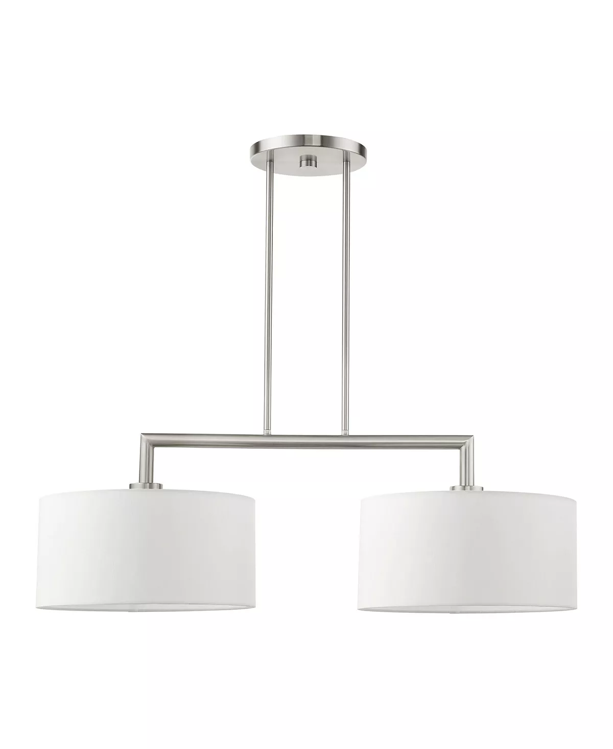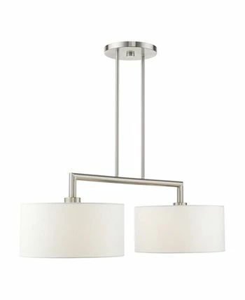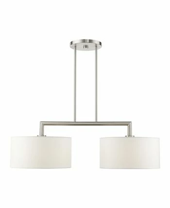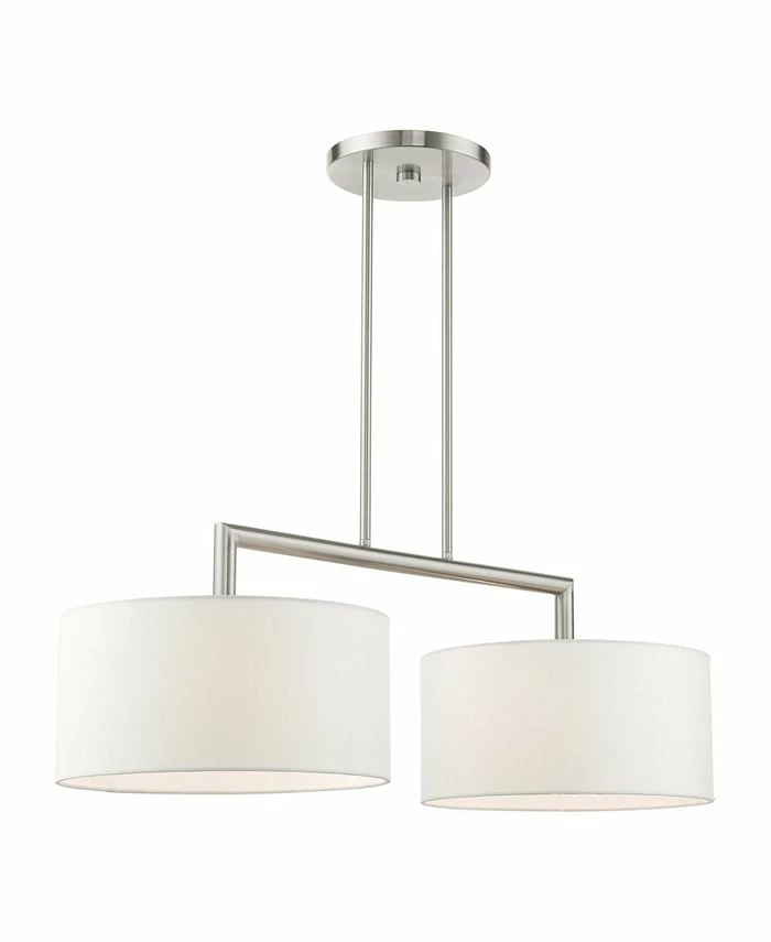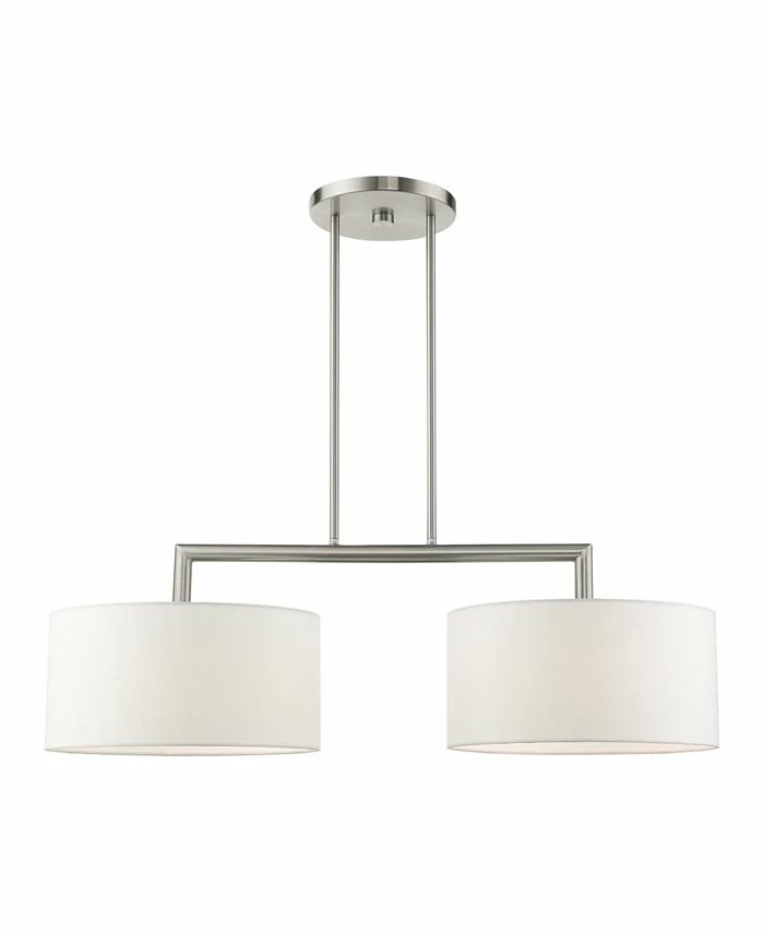 The Meridian collection has a clean, crisp look and contemporary appeal. The hand-crafted off-white fabric hardback shades offer a diffused warm light. This two-light linear chandelier has a sleek upper frame over the shades.