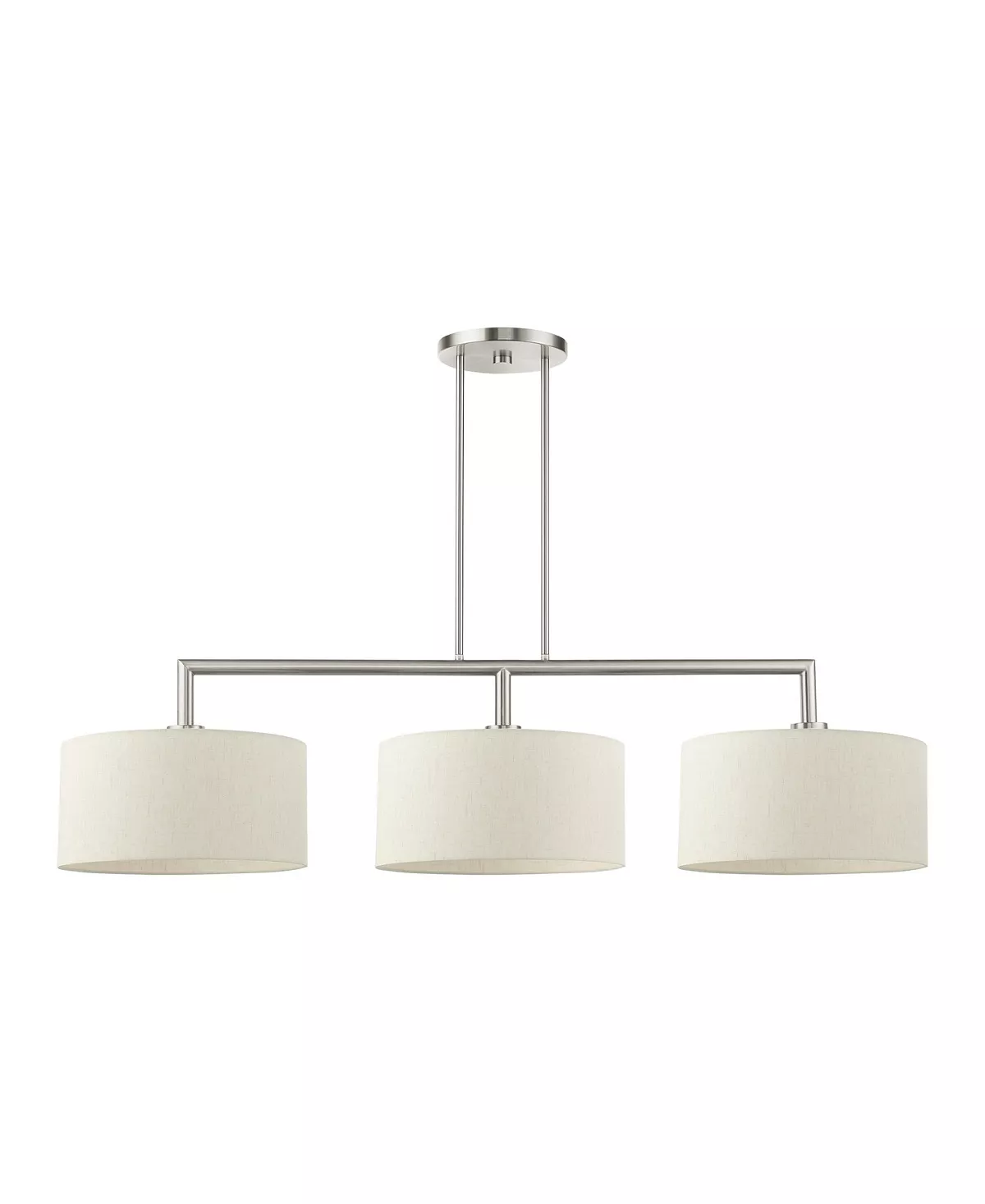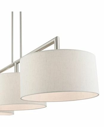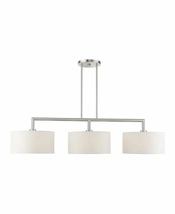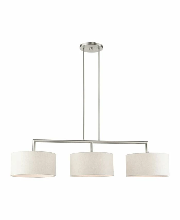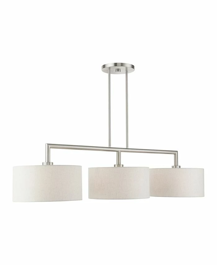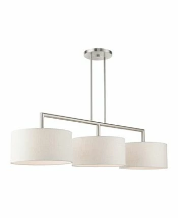 The Meridian collection has a clean, crisp look and contemporary appeal. The hand-crafted of fabric hardback shades offer a diffused warm light. This three-light linear chandelier has a sleek upper frame over the three shades.