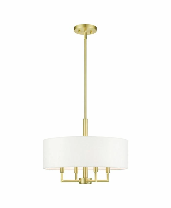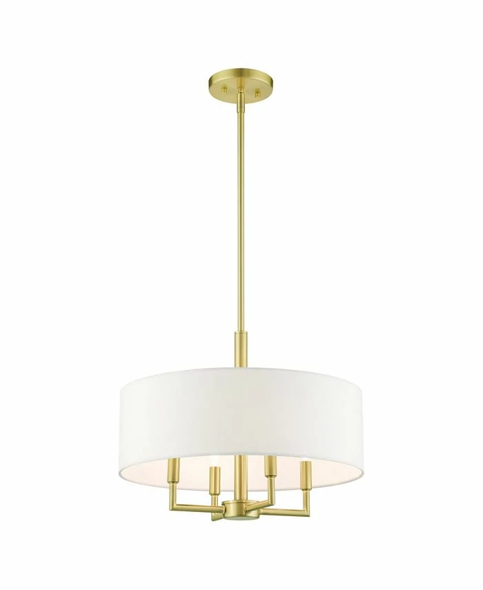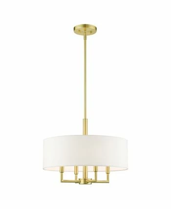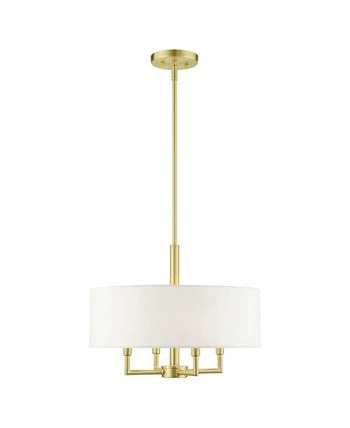 The Meridian collection has a clean, crisp look and contemporary appeal. The hand-crafted off-white fabric hardback shade offers a diffused warm light. This four-light pendant chandelier has sleek exposed angular arms making it tasteful to elevate your style.