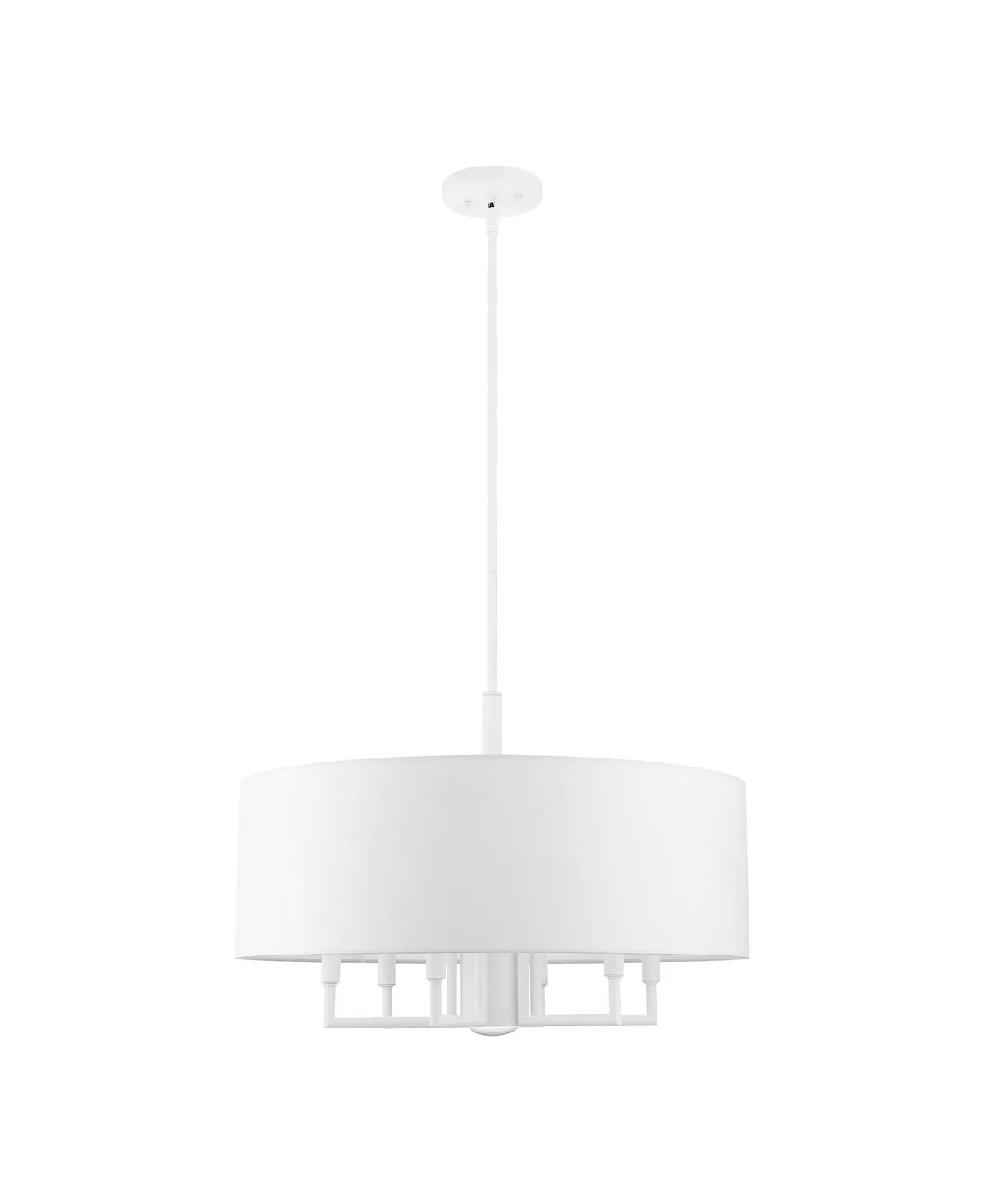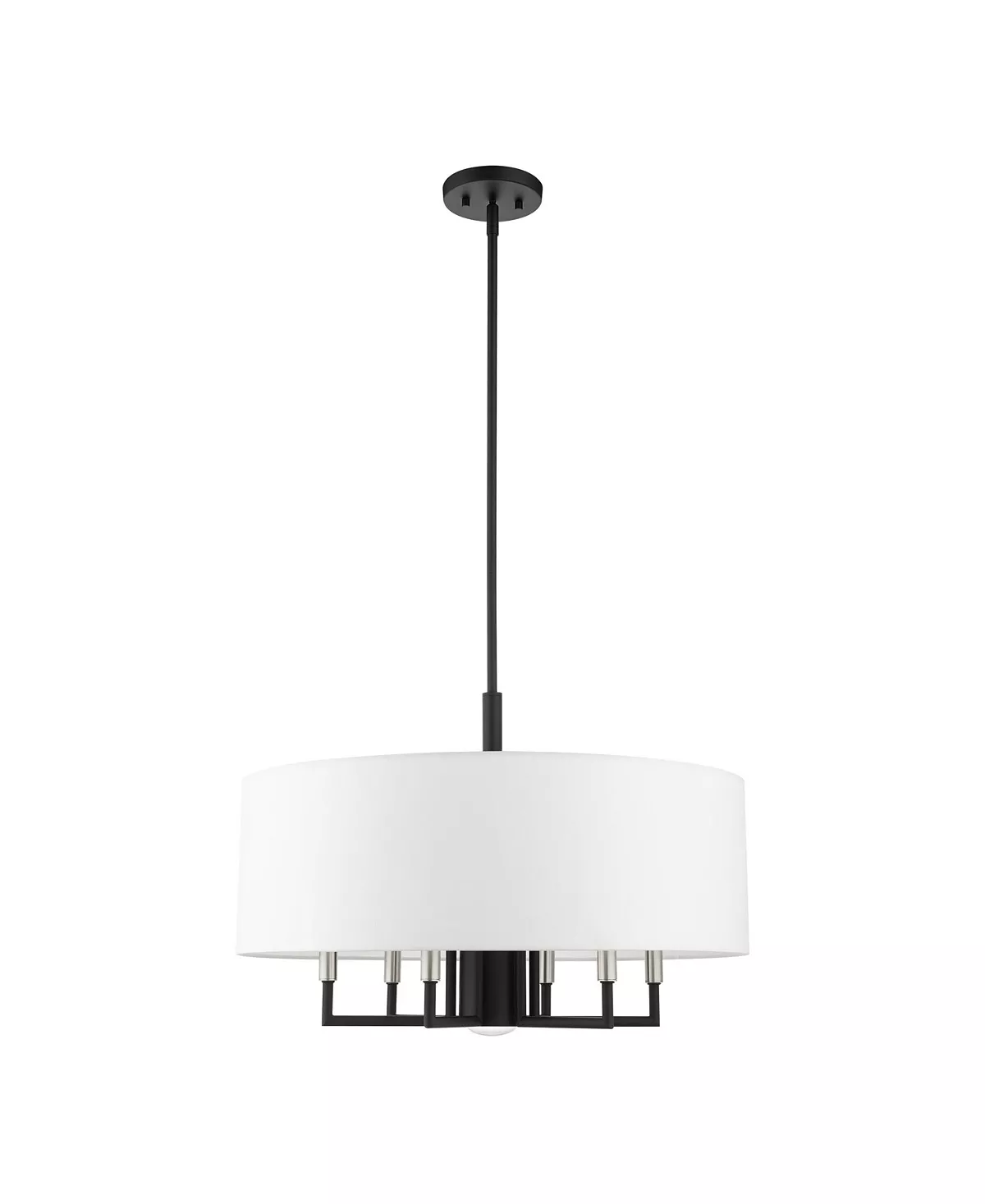 The Meridian collection has a clean, crisp look and contemporary appeal. The hand-crafted off-white fabric hardback shade offers a diffused warm light. This seven-light pendant chandelier has exposed angular arms featuring one down light.
