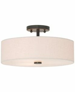 Simple in its elegance, the Meridian semi flush mount from Livex is ideal for modern décors. A hand-crafted drum shade in an oatmeal finish hangs from the bronze-tone steel base.