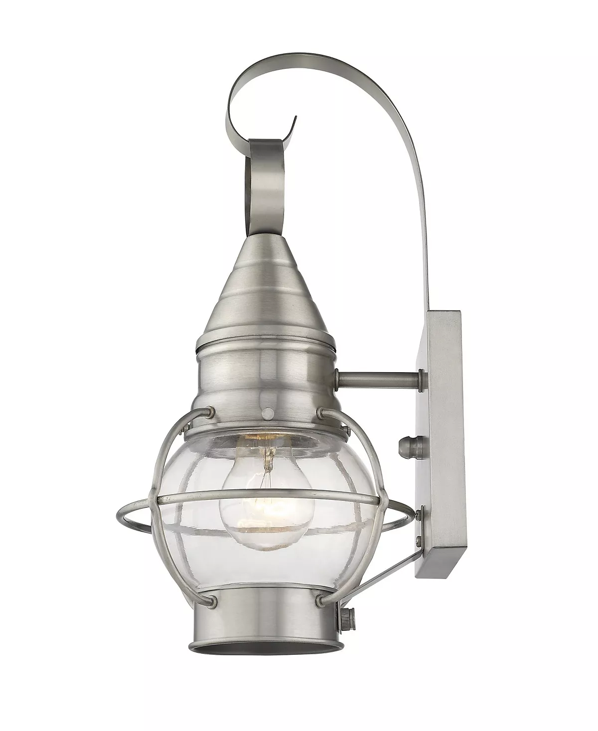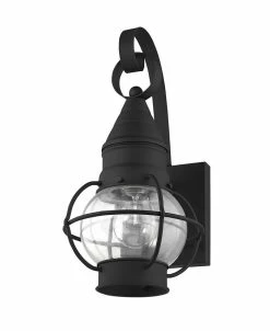 The Newburyport outdoor wall lantern boasts classic nautical and railway styling with a beautiful hand blown clear glass globe and a finish over the solid brass construction.