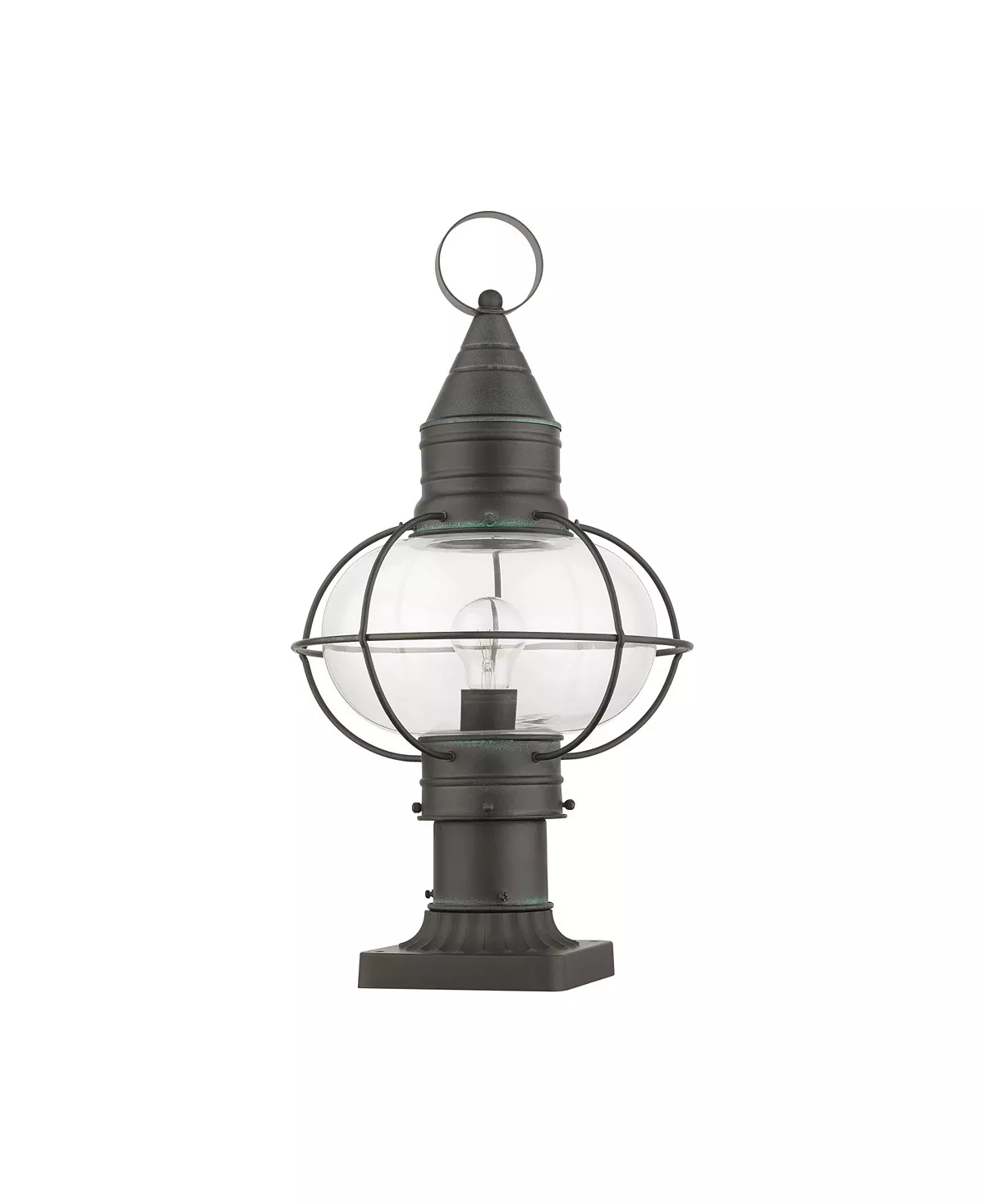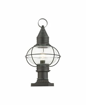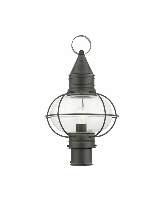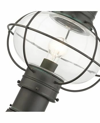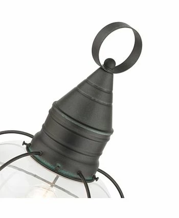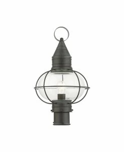 The Newburyport outdoor large single-light post top lantern boasts classic nautical and railway styling. This piece features a beautiful hand-blown clear glass globe and a charcoal finish over the hand crafted solid brass construction.