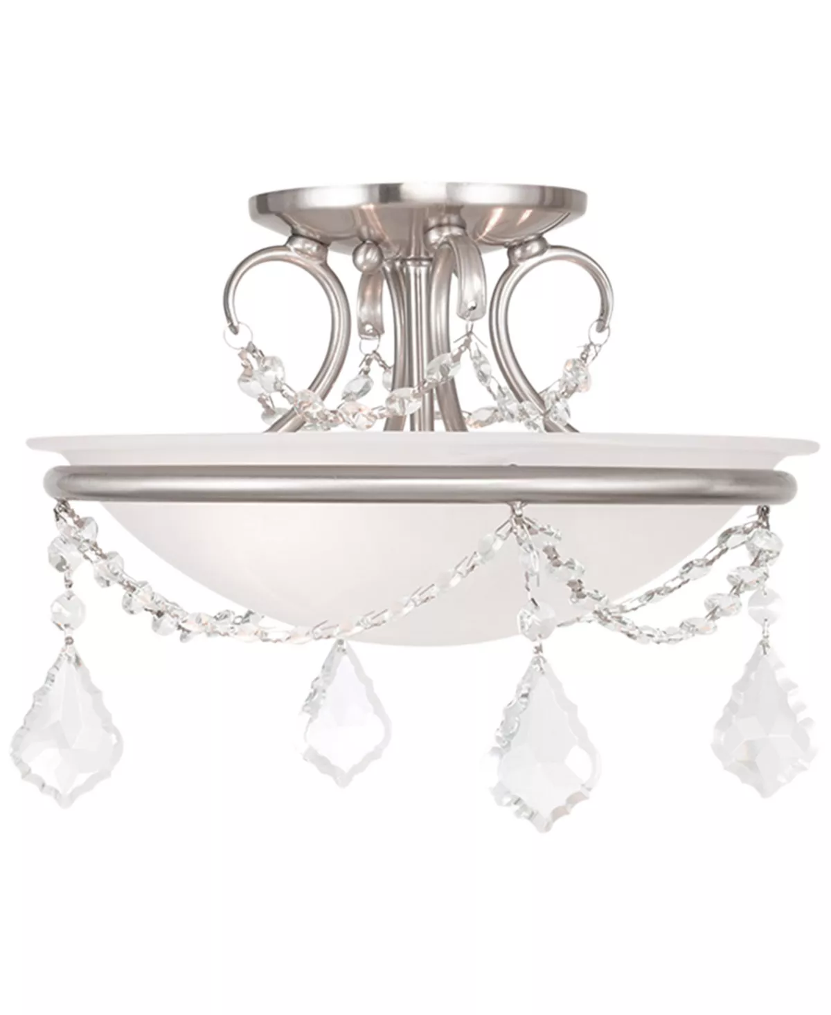 Bring elegance and sophistication to any space with the Pennington Semi-Flush chandelier. A white, alabaster glass bowl shade is suspended by a brushed nickel-tone frame and adorned with glistening crystal accents