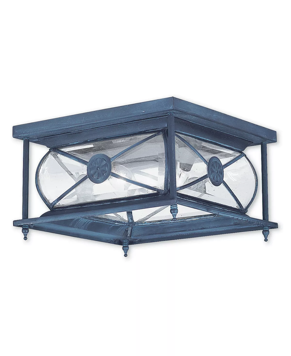 This charming outdoor ceiling mount lantern will enhance your exterior spaces with traditional elegance. Featuring a charcoal finish, and solid brass body, this light is shaded with enchanting clear beveled glass that adds character.