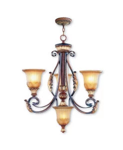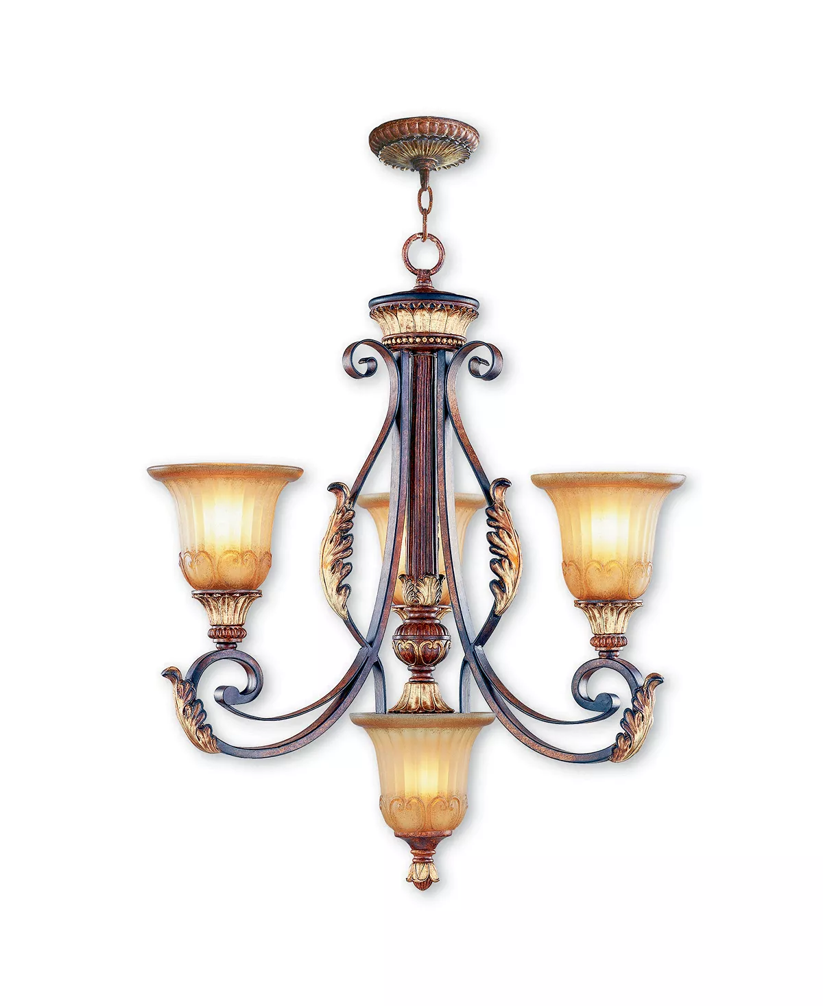 The Villa Verona collection of interior lighting features handsomely styled ironwork complete with scrolling details. This chandelier features a Verona bronze finish with aged gold leaf accents and rustic art glass.