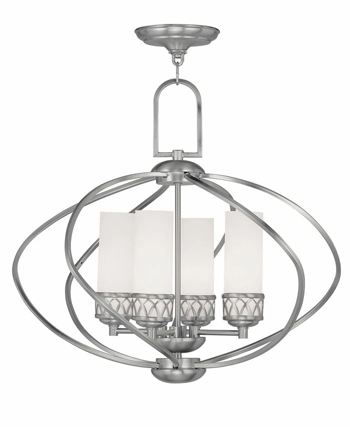 A variety of design elements beautifully merge in the Westfield Chandelier light from Livex. Ample curves in a brushed nickel-tone finish are juxtaposed to handblown, cylindrical glass shades for a striking effect.