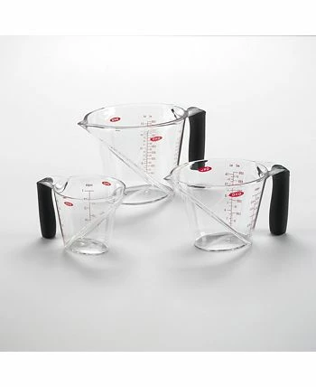 The patented angled surface on these measuring cups lets you read measurements from above, eliminating the need to fill, check and adjust the amount.
