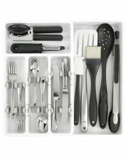 An orderly fashion! Solve all of your kitchen storage conundrums with this expandable utensil organizer, which quickly becomes the perfect fit for your space. Adjustable dividers shift to accommodate forks, knives and spoons of all shapes and sizes, while also making room to store even more. The innovative design keeps utensils neatly stacked when the drawer opens & closes, too!