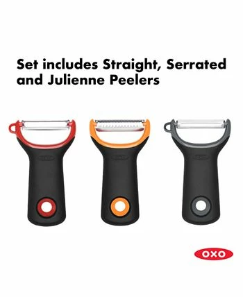 - Set includes a straight peeler, a julienne peeler and a serrated peeler
