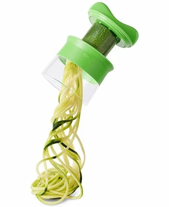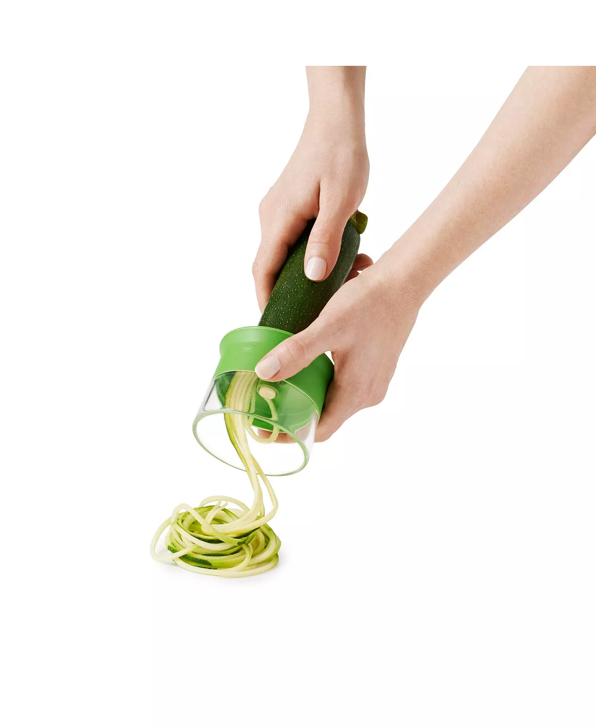 The OXO Good Grips Hand-Held Spiralizer creates curly noodles from zucchinis, cucumbers and other long vegetables for pasta-like dishes, salads and garnishes. The open-blade design accommodates round vegetables like potatoes and beets for curly fries, frittatas and more. The included food holder keeps hands safe and helps you use all of the vegetable, minimizing waste. The Good Grips Spiralizer is BPA-free and features green accents. When you’re finished, clean it in the dishwasher and use the food holder as a cap for safe storage.