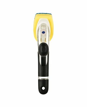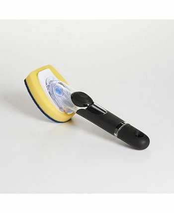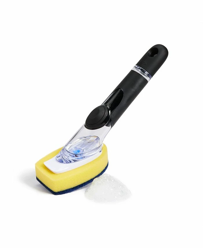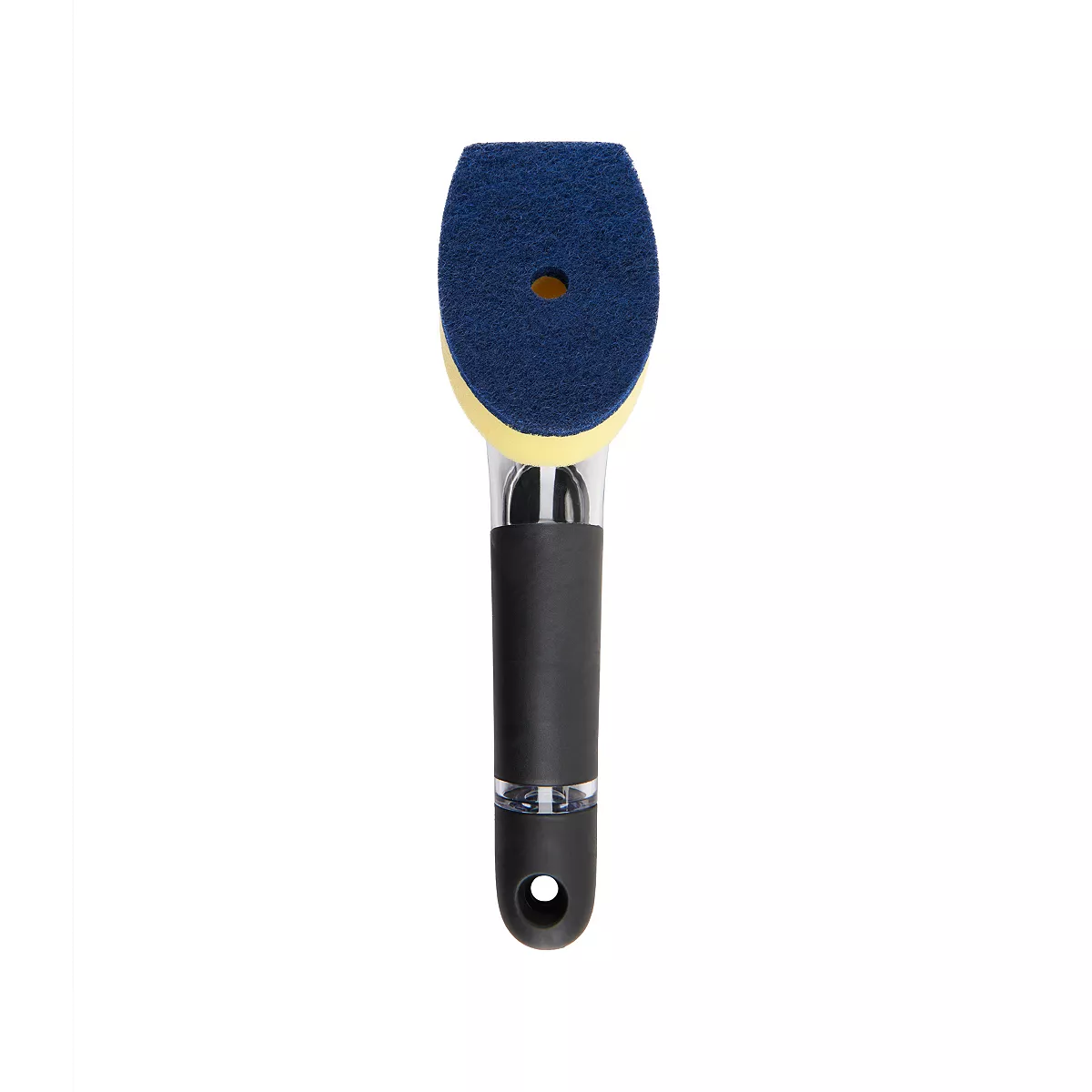 This tool takes the work out of re-soaping your dish scrub. The OXO Good Grips Soap Dispensing Dish Scrub releases an ideal amount of soap with the press of a non-slip button. A specially designed valve keeps the dispenser sealed when not in use to stop soap waste. The Scrub head is ideal for cleaning utensils, plates and non-stick bakeware while the long-reach handle helps hit hard-to-clean places. Flip the head over and use the built-in scraper to remove baked-on bits. The Soap Dispensing Dish Scrub is easy to refill: unscrew the cap, add your favorite soap and replace the cap. When it’s time for a fresh top, just push up on the tab and pop on a replacement.