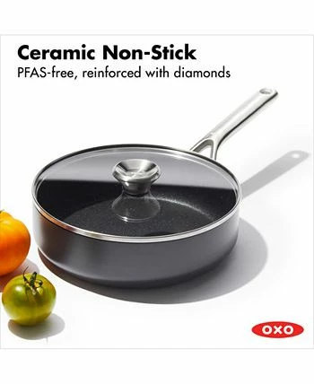 Enjoy effortless nonstick performance that lasts with this OXO sauté pan. Its ceramic coating is diamond-reinforced, while the hard-anodized body heats quickly.